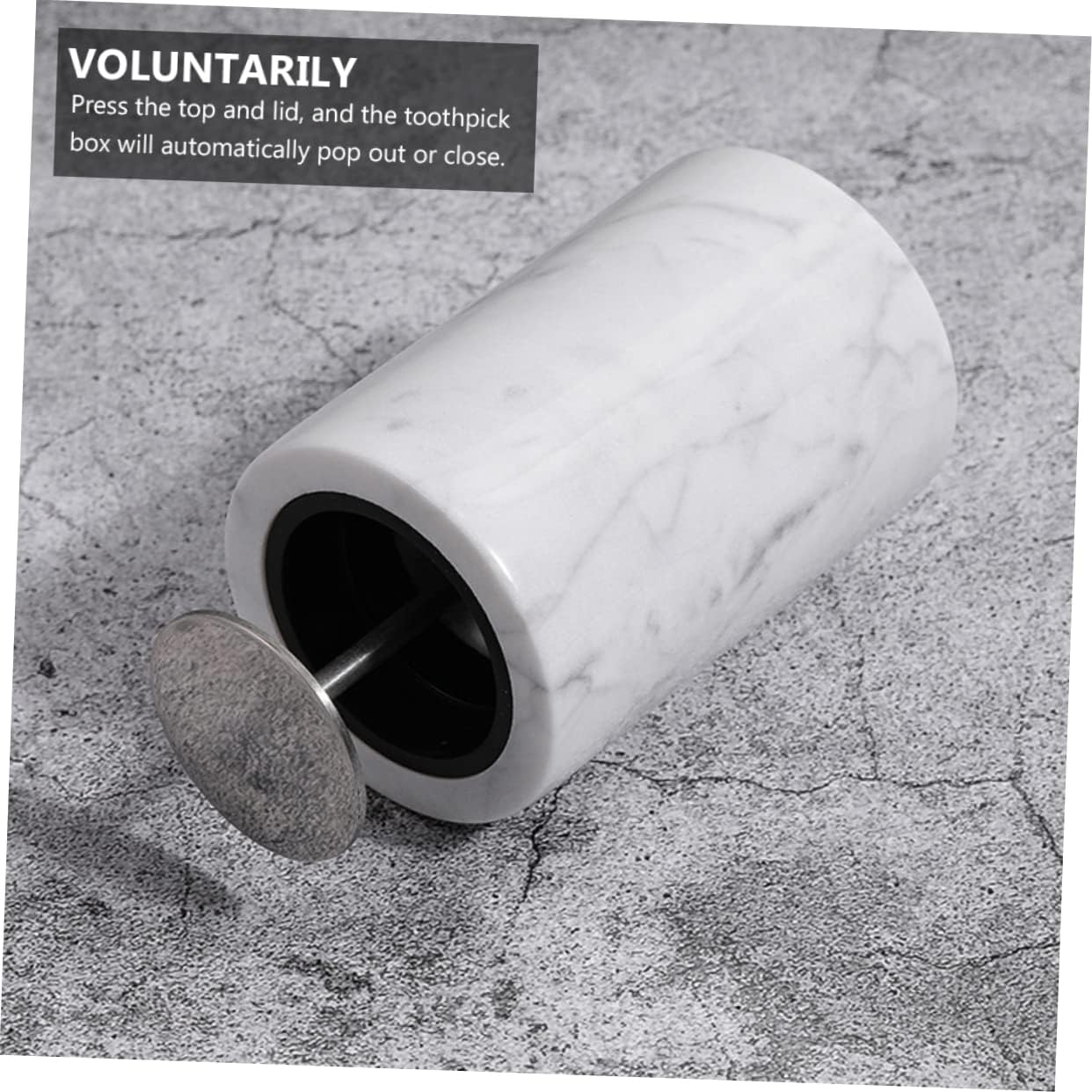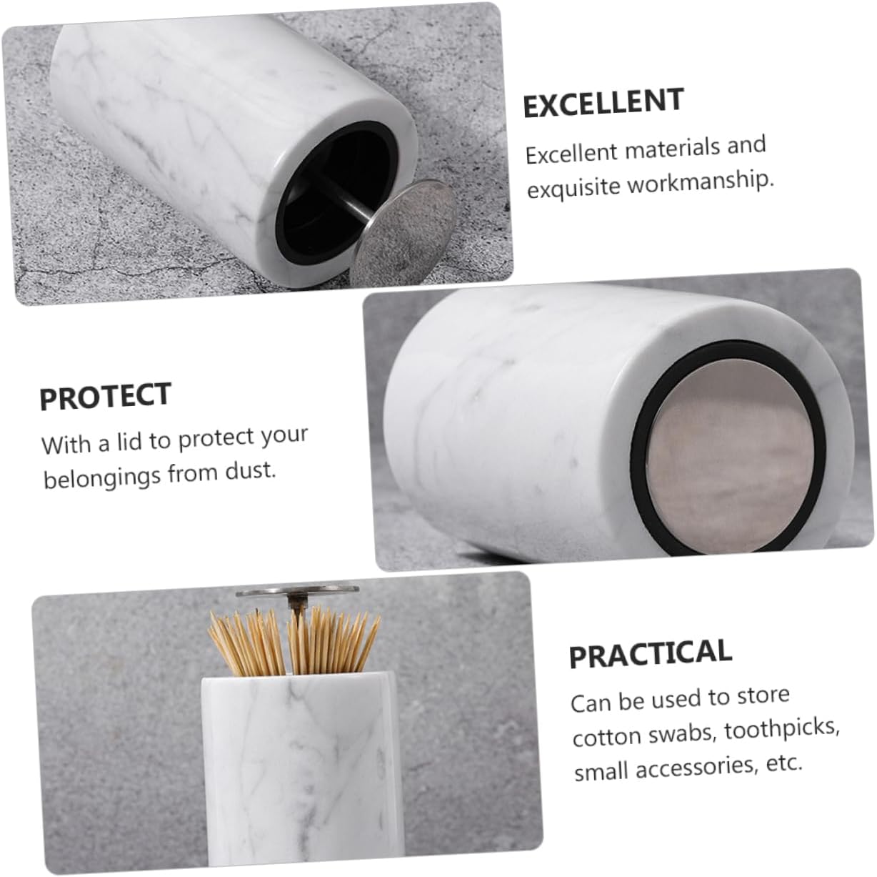 Package List 1 x Toothpicks Holder Features -Product Info:Toothpick Cotton Box -Material: Marble toothpick holders marble -Size: 7.00X7.00X11.00cm/2.75X2.75X4.32in tall toothpick holder -Color:Light Grey toothpicks dispenser - Modern marbling pattern design makes it more stylish and decorative toothpicks holder. - Can be used to store cotton swabs, toothpicks, small accessories, etc decorative toothpick holder. - You can wash with water and then organize cotton swabs, toothpicks or other items marble toothpick holder. - Press the and lid, and the toothpick box will automatically out or close toothpick holders. - Excellent materials and workmanship toothpick container.Goods Descriptioncute toothpick holder This is a toothpick storage box.toothpick holder with lid Can be used to store cotton swabs, toothpicks, small accessories, etc.toothpick holders marble The space-saving design provides lots of space to store lots of small necessities.toothpick holder for longer toothpicks With a lid to protect your belongings.tall toothpick holder Made of material, .marble toothpick holder The marble pattern makes it stylish