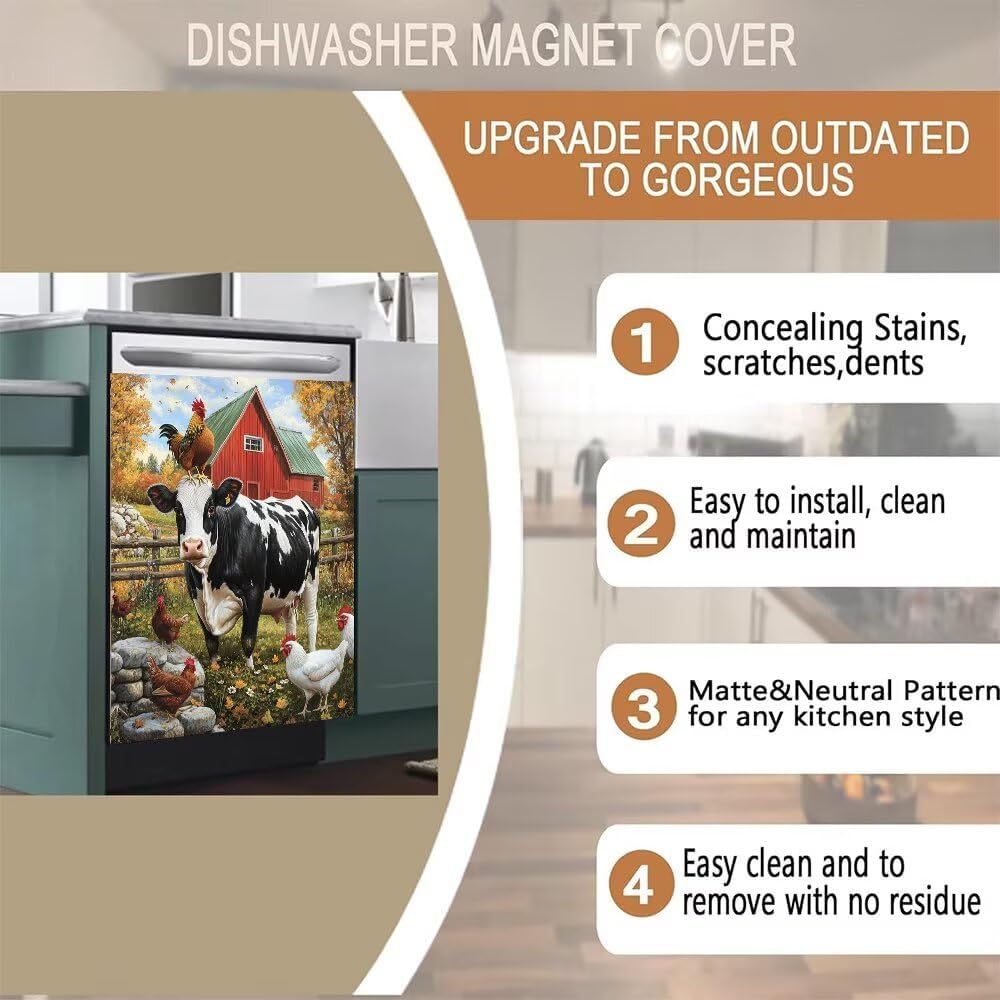 Do you think your kitchen is too simple and boring, and not special enough?Or do you think the color of your dishwasher or refrigerator is not good?Come on a Cow Roosters Hens kitchen decoration, let your kitchen instantly have color and style, highlight your personal quality of life, and beautify your living environment.✔Size details:23W x 26H inches (58.5 W x 66 H cm) which fit about 90% of all dishwashers.✔Magnet Cover features:Material: Self-Adhesive PVC, PET Film and magnet.Use: Easy to paste, no sticky residue, can be moved and changed at will. Suitable for decorating the surface of the dishwasher or the surface of the refrigerator (the surface of the equipment needs to contain magnetism).WHY YOU SHOULD TO BUY Magnetic DISHWASHER COVER? Magnetic Removable, Reusable.Dustproof, Waterproof and UV Resistant.Reusable, removable.Installation is very simple.Installation is very simple!✔Please Note: Just ensure that your dishwasher is magnetic before ordering the dishwasher cover magnet, Stainless steel appliances are not magnetic.If you have any questions about the product, please feel free to contact us to deal with the problem.