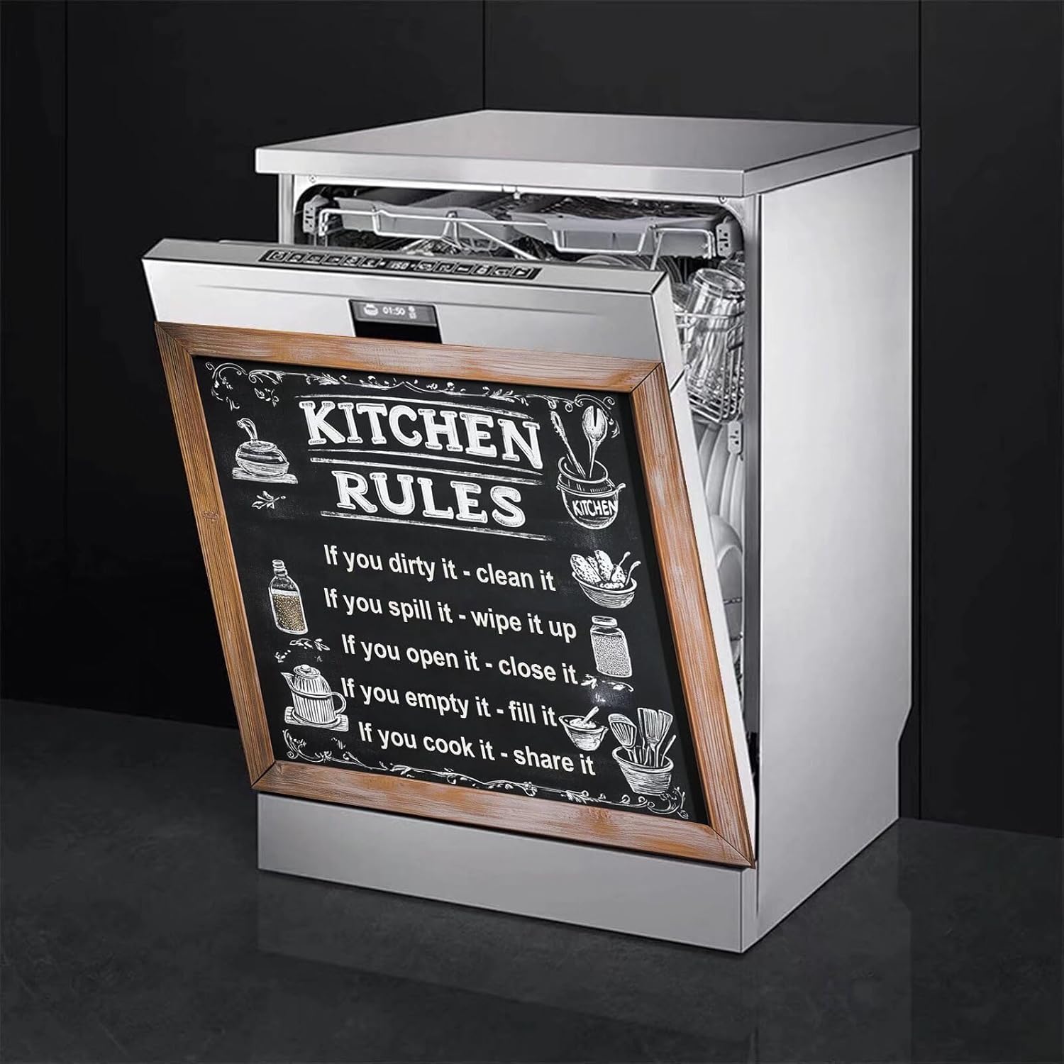 Product Highlights.ENHANCE KITCHEN DECORATION: This stylish magnetic dishwasher cover can update the look of any kitchen, giving it a modern and stylish appearance.VERSATILE USE: The magnetic dishwasher cover is easy to install and remove, convenient to switch designs or clean the cover.DURABLE MATERIAL: This dishwasher magnetic cover is made of high quality magnetic sheet, durable and protects your dishwasher from scratches and dents.EASY TO CLEAN: Simply wipe with a damp cloth to remove any smudges or stains and keep your dishwasher clean.Usage Scenarios.Ideal for homeowners looking to update the look of their kitchen without the need for a full remodel.Ideal for renters who want to personalize their living space without making permanent changes.Ideal for those who want to protect their dishwasher from daily wear and tear, but also want to add a decorative touch to their kitchen.All in all, this dishwasher magnet cover is a practical and stylish solution that enhances your kitchen décor and protects your dishwasher at the same time. With this versatile and durable magnetic cover, you can effortlessly upgrade your kitchen.