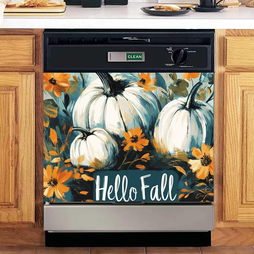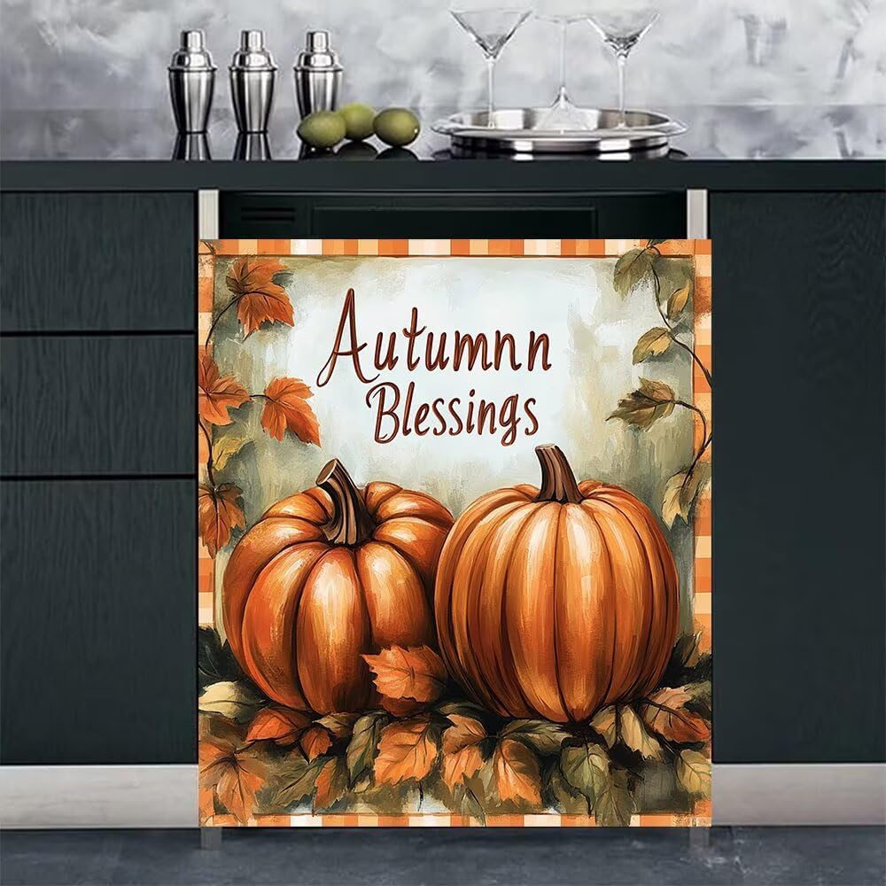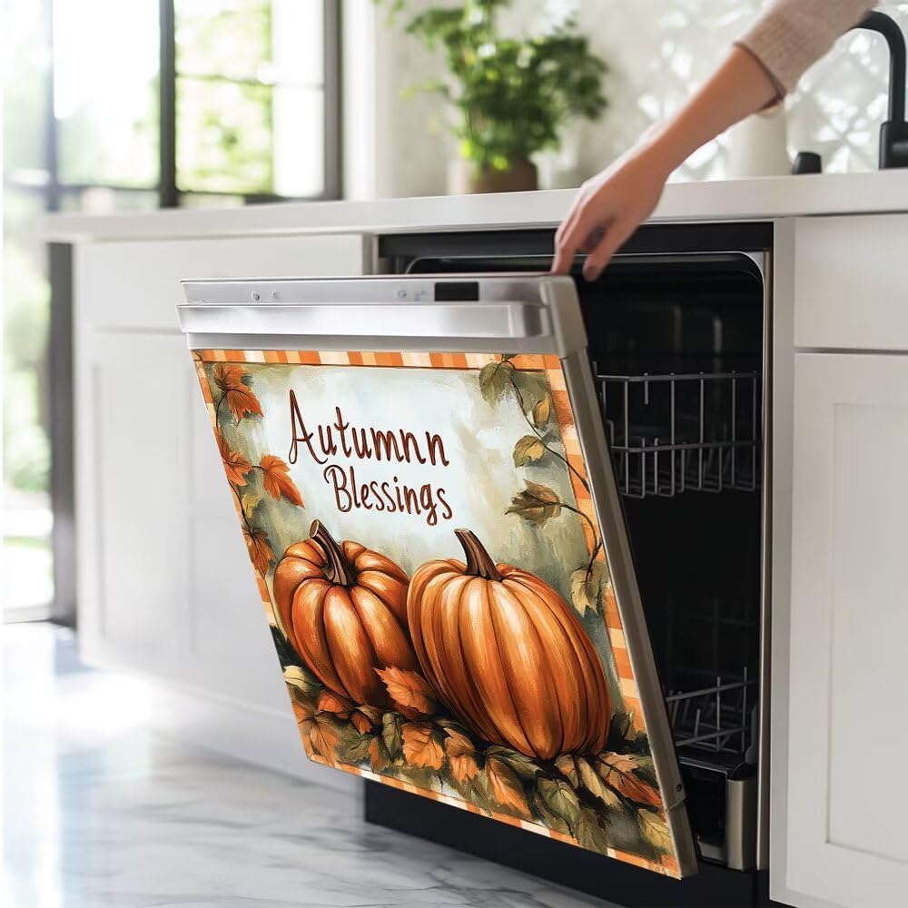 REFRESHES YOUR APPLIANCES!If you have a dishwasher full of scratches and concave surfaces, it doesn’t fit your kitchen!Do you want it to look brand new?Give the dishwasher a second life!we magnetic dishwasher cover can help you.Fall Pumpkins Dishwasher cover magnet refreshes you appliancesBeautiful and practical! Don't need to spend a lot of money. You can have "new" dishwasher.【size】23 W x 17 H inches; 58.5 W x 43 H cm;23 W x 26 H inches; 58.5 W x 66 H cm;Dishwasher magnet cover fits 90% of dishwasher panels, but you can easily trim it to the size of the front face of your dishwasher.ATTENTION:1.Make sure your appliance has a metallic surface which attracts magnets. Take a big fridge magnet and place it onto the dishwasher. This is to test If the magnet doesn't stick neither will this product. If the Fridge Magnet sticks this probably wont stick well or at all. Its very important you have a strong magnetic dishwasher, Most Do!2. If the dishwasher cover doesn't stick use strong glue or double sided tape.Our magnetic dishwasher panel cover is a perfect complement to your DIY kitchen upgrade!