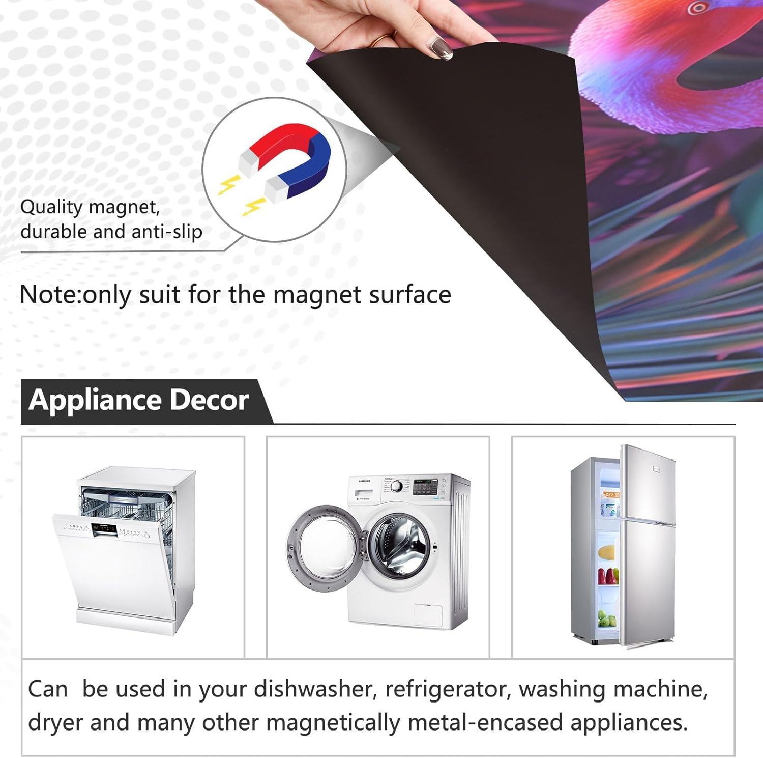 Decorate your kitchen life!This magnetic dishwasher cover is a work of art, decorating your kitchen art, with a sense of fashion and art, highlighting your quality life!Size in 23 x 26 inches. This size fits most dishwashers.Cut it to your own size to fits your need.FeatureWaterproof, heat resistant, scratch and tear resistant. Magnetic stickers hide scratches, dents or other unsightly marks.Magnetic MaterialMagnetic sticker will not fall from magnetic dishwasher and disassemble easily.Protect the dishwasher from scratches, it can also decorate your kitchen home.Please NoteMagnetic dishwasher cover is made of PVC+PET, only suit for the magnet surface.Install: Trim the proofreading position, the magnetic force on the back will stick to it.