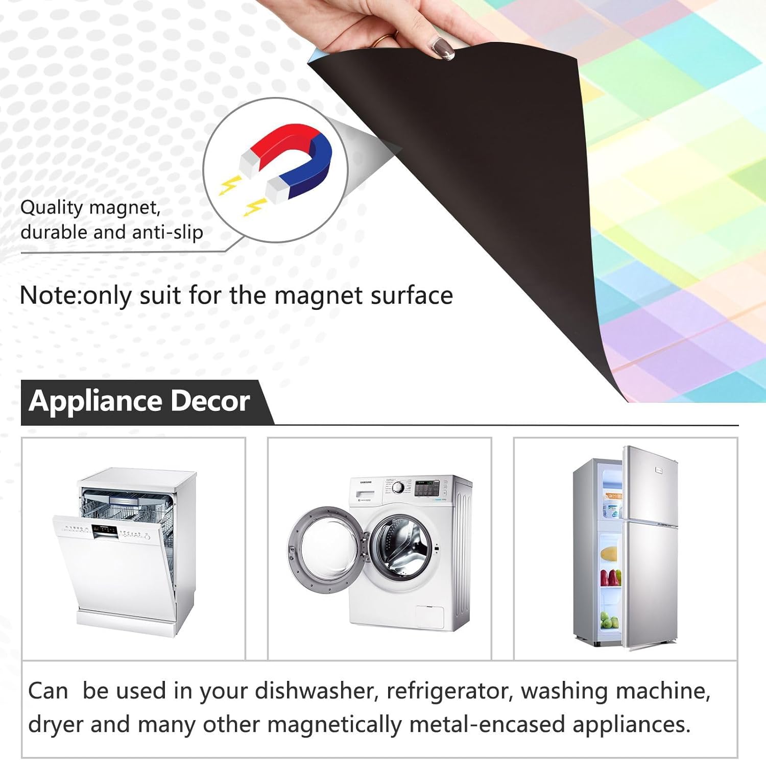 Decorate your kitchen life!This magnetic dishwasher cover is a work of art, decorating your kitchen art, with a sense of fashion and art, highlighting your quality life!Size in 23 x 26 inches. This size fits most dishwashers.Cut it to your own size to fits your need.FeatureWaterproof, heat resistant, scratch and tear resistant. Magnetic stickers hide scratches, dents or other unsightly marks.Magnetic MaterialMagnetic sticker will not fall from magnetic dishwasher and disassemble easily.Protect the dishwasher from scratches, it can also decorate your kitchen home.Please NoteMagnetic dishwasher cover is made of PVC+PET, only suit for the magnet surface.Install: Trim the proofreading position, the magnetic force on the back will stick to it.