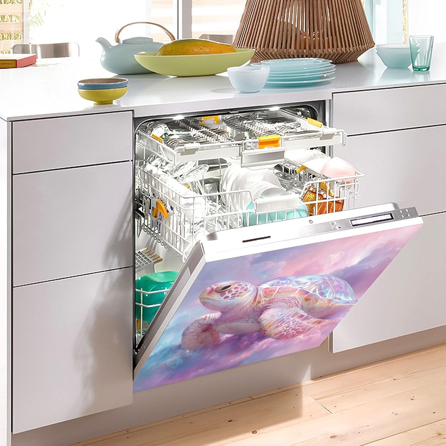 Decorate your kitchen life!This magnetic dishwasher cover is a work of art, decorating your kitchen art, with a sense of fashion and art, highlighting your quality life!Size in 23 x 26 inches. This size fits most dishwashers.Cut it to your own size to fits your need.FeatureWaterproof, heat resistant, scratch and tear resistant. Magnetic stickers hide scratches, dents or other unsightly marks.Magnetic MaterialMagnetic sticker will not fall from magnetic dishwasher and disassemble easily.Protect the dishwasher from scratches, it can also decorate your kitchen home.Please NoteMagnetic dishwasher cover is made of PVC+PET, only suit for the magnet surface.Install: Trim the proofreading position, the magnetic force on the back will stick to it.