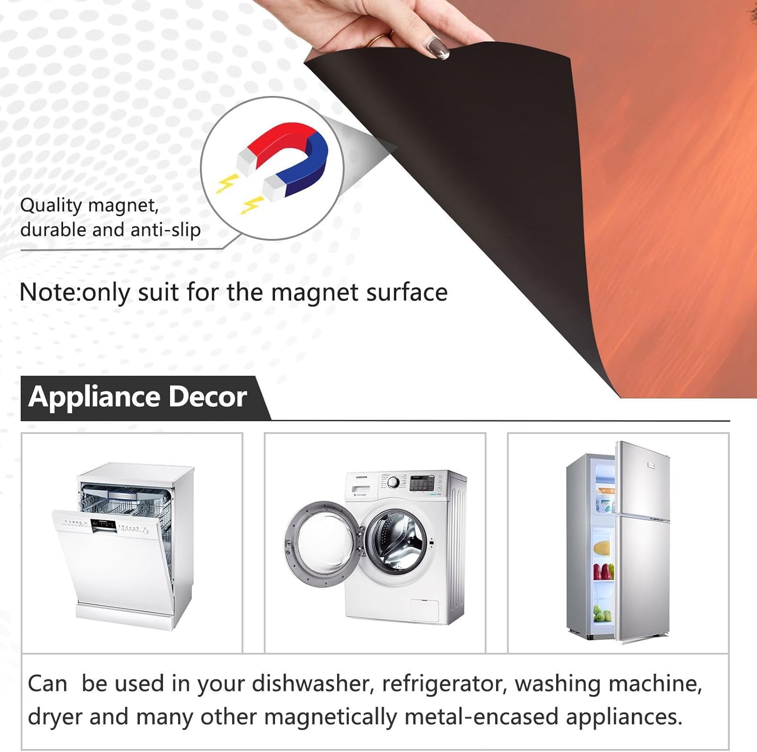 Decorate your kitchen life!This magnetic dishwasher cover is a work of art, decorating your kitchen art, with a sense of fashion and art, highlighting your quality life!Size in 23 x 26 inches. This size fits most dishwashers.Cut it to your own size to fits your need.FeatureWaterproof, heat resistant, scratch and tear resistant. Magnetic stickers hide scratches, dents or other unsightly marks.Magnetic MaterialMagnetic sticker will not fall from magnetic dishwasher and disassemble easily.Protect the dishwasher from scratches, it can also decorate your kitchen home.Please NoteMagnetic dishwasher cover is made of PVC+PET, only suit for the magnet surface.Install: Trim the proofreading position, the magnetic force on the back will stick to it.