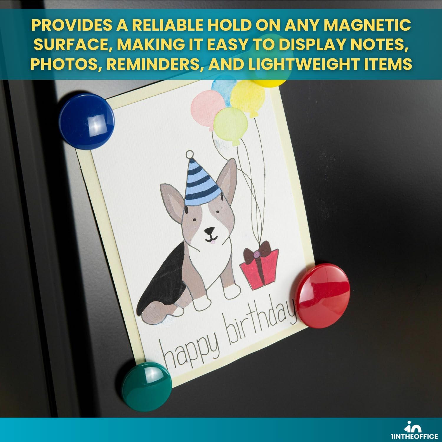 1InTheOffice Assorted Magnets, 60-Pack The 1InTheOffice Assorted Magnets pack is designed for general-purpose attachment and display on magnetic surfaces. This bulk pack contains 60 individual magnets, providing a versatile supply for organizing, decorating, and posting lightweight items in various environments. Constructed as basic ceramic or ferrite magnets, each piece offers a functional magnetic hold suitable for securing paper, photos, notes, and lightweight signage. The magnets are intended for use on standard magnetic-receptive surfaces commonly found in homes, offices, and schools. Key Product Details: Total Quantity: 60 magnets per pack. Size Assortment: The pack includes a mix of small, medium, and large magnet sizes. Color Assortment: Magnets come in five distinct colors: blue, green, pink, purple, and white. Primary Function: To attach and hold lightweight, non-metallic items to steel surfaces. Intended Surfaces: These magnets are compatible with ferrous metal surfaces such as refrigerators, file cabinets, metal desks, magnetic whiteboards, and tool cabinets. Typical Applications: Posting documents, reminders, and children's artwork on a refrigerator. Organizing notes, schedules, or photos on a metal cabinet or magnetic board. Creating temporary displays or color-coded systems for projects. Securing lightweight signage or menus to a magnetic surface. The assortment of sizes allows users to select an appropriately sized magnet for the item being held, from a small note to a standard sheet of paper. The variety of colors enables visual organization, thematic decorating, or simple aesthetic preference when displaying items. This product is a practical and economical solution for everyday magnetic attachment needs in domestic, educational, and office settings.