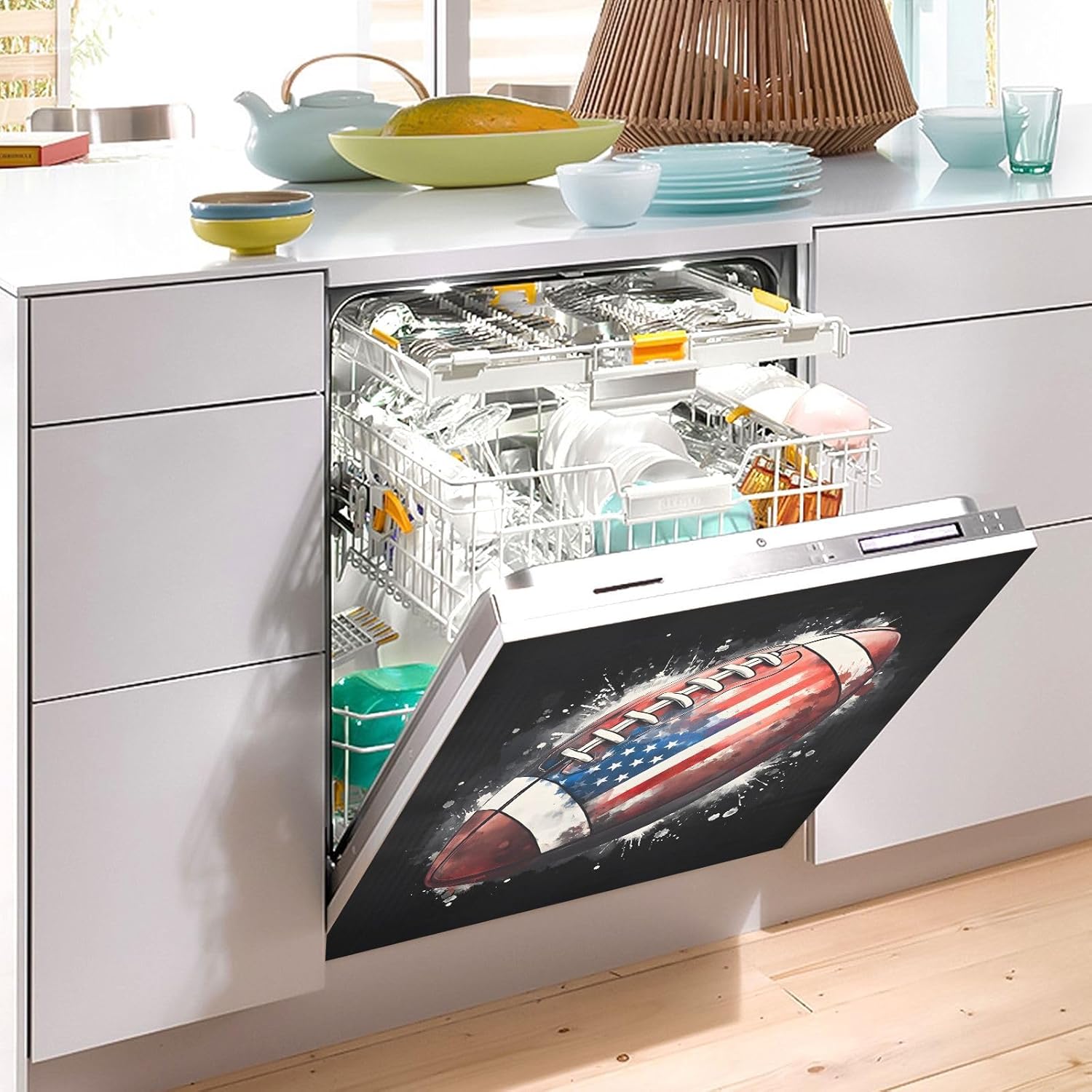 Decorate your kitchen life!This magnetic dishwasher cover is a work of art, decorating your kitchen art, with a sense of fashion and art, highlighting your quality life!Size in 23 x 26 inches. This size fits most dishwashers.Cut it to your own size to fits your need.FeatureWaterproof, heat resistant, scratch and tear resistant. Magnetic stickers hide scratches, dents or other unsightly marks.Magnetic MaterialMagnetic sticker will not fall from magnetic dishwasher and disassemble easily.Protect the dishwasher from scratches, it can also decorate your kitchen home.Please NoteMagnetic dishwasher cover is made of PVC+PET, only suit for the magnet surface.Install: Trim the proofreading position, the magnetic force on the back will stick to it.
