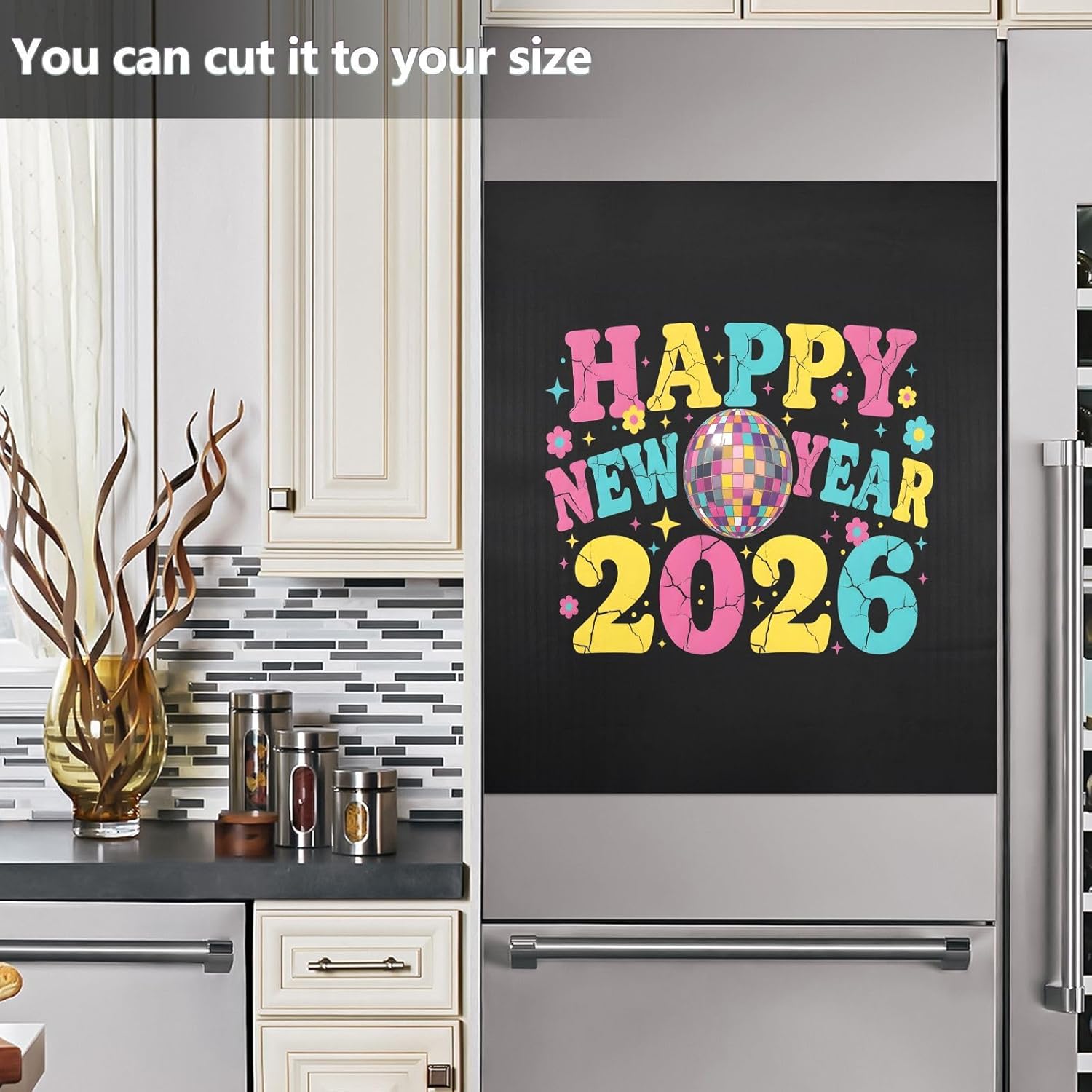 Decorate your kitchen life!This magnetic dishwasher cover is a work of art, decorating your kitchen art, with a sense of fashion and art, highlighting your quality life!Size in 23 x 26 inches. This size fits most dishwashers.Cut it to your own size to fits your need.FeatureWaterproof, heat resistant, scratch and tear resistant. Magnetic stickers hide scratches, dents or other unsightly marks.Magnetic MaterialMagnetic sticker will not fall from magnetic dishwasher and disassemble easily.Protect the dishwasher from scratches, it can also decorate your kitchen home.Please NoteMagnetic dishwasher cover is made of PVC+PET, only suit for the magnet surface.Install: Trim the proofreading position, the magnetic force on the back will stick to it.Ideal GiftYour beloved one will be happy when you give him/her this dishwasher magnet cover gift on the special days like Housewarming Day, Mother's Day, Father's Day, Birthday, Halloween, Thanksgiving, Christmas, New Year.