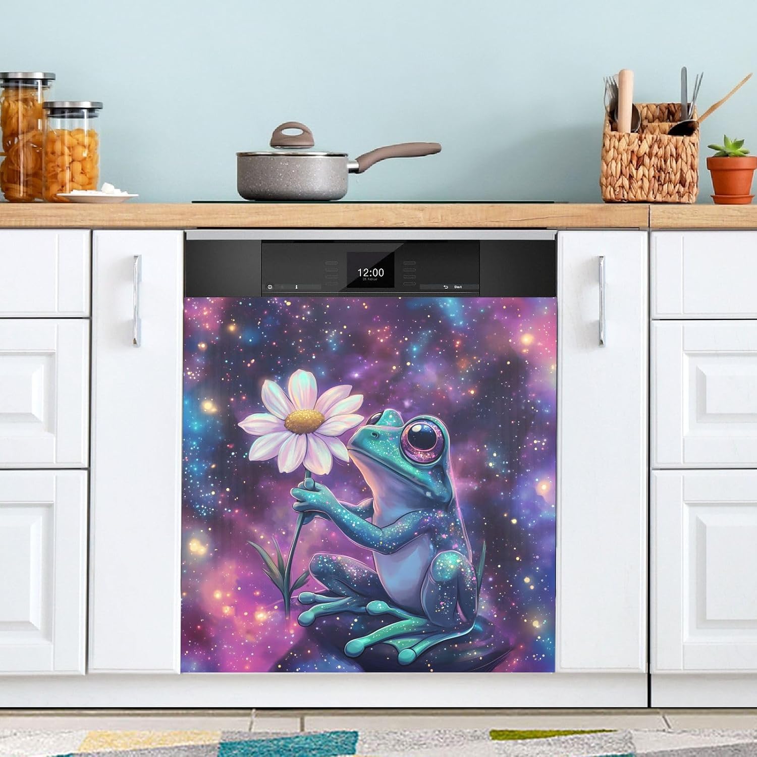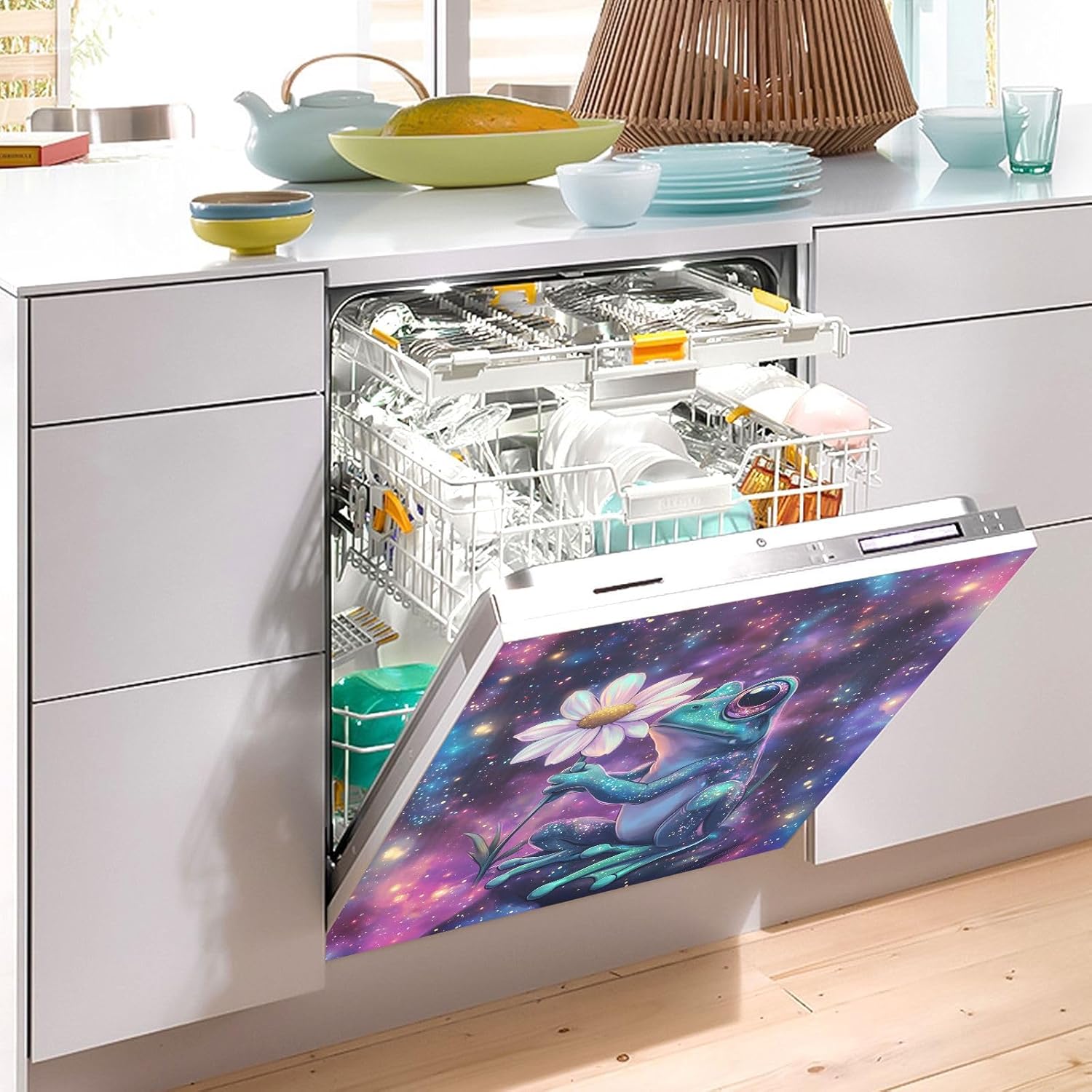 Decorate your kitchen life!This magnetic dishwasher cover is a work of art, decorating your kitchen art, with a sense of fashion and art, highlighting your quality life!Size in 23 x 26 inches. This size fits most dishwashers.Cut it to your own size to fits your need.FeatureWaterproof, heat resistant, scratch and tear resistant. Magnetic stickers hide scratches, dents or other unsightly marks.Magnetic MaterialMagnetic sticker will not fall from magnetic dishwasher and disassemble easily.Protect the dishwasher from scratches, it can also decorate your kitchen home.Please NoteMagnetic dishwasher cover is made of PVC+PET, only suit for the magnet surface.Install: Trim the proofreading position, the magnetic force on the back will stick to it.Ideal GiftYour beloved one will be happy when you give him/her this dishwasher magnet cover gift on the special days like Housewarming Day, Mother's Day, Father's Day, Birthday, Halloween, Thanksgiving, Christmas, New Year.