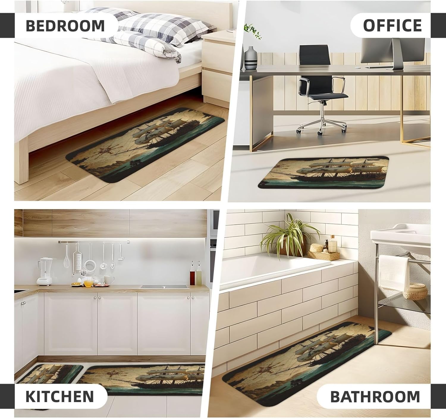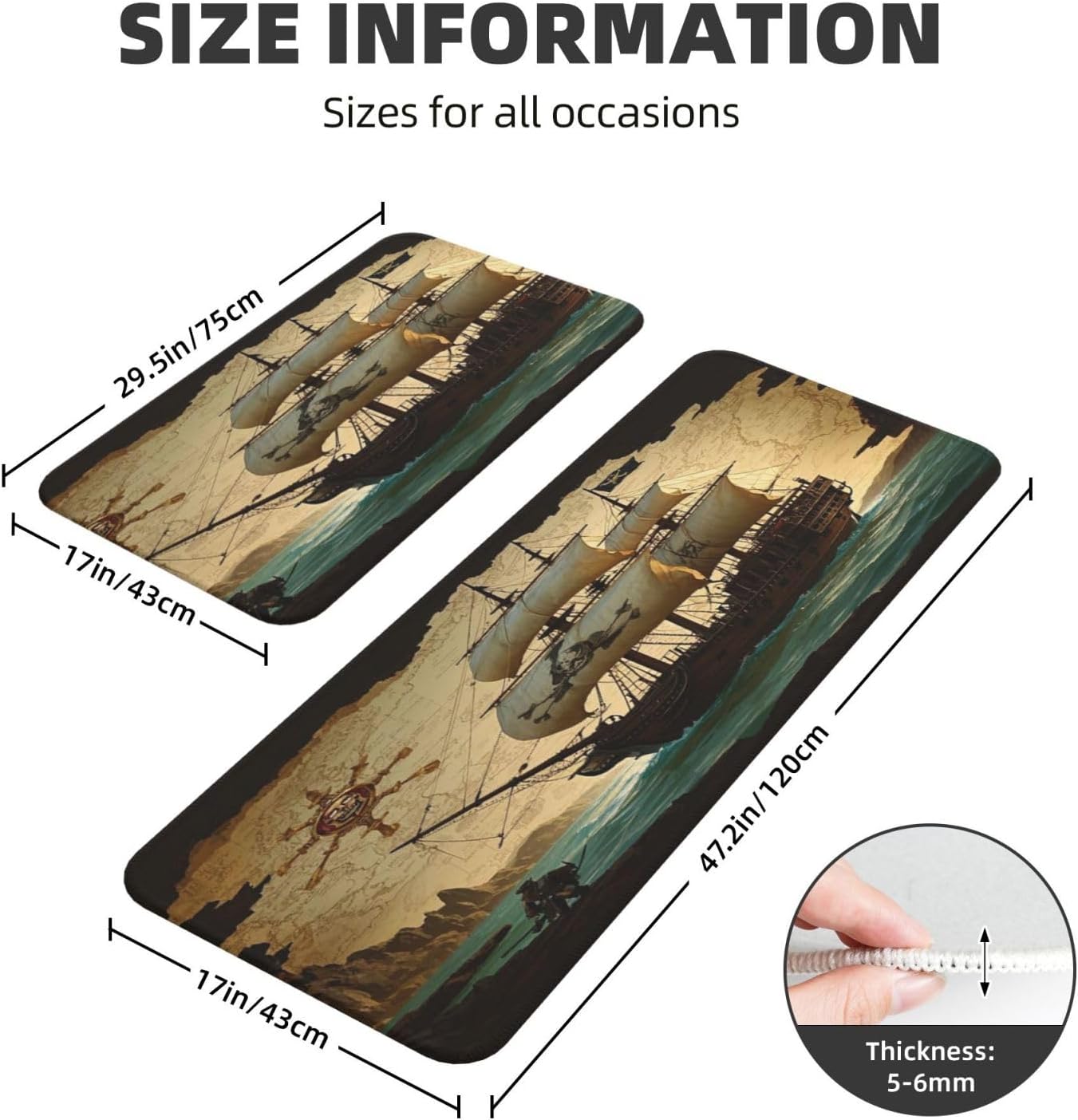 Kitchen Rugs and Mats, Anti Fatigue Comfort Standing Kitchen Runner Mat Vintage Map Pirate Ship Kitchen Floor Mat 2 Sets Boho Kitchen Rug for Kitchen Decor Floor Mat Runner Carpet for Hallways Farmhouse Kitchen Mat, Cushioned Anti Fatigue Kitchen Mats for Floor, Non Slip Rugs for Kitchen Floor, Vintage Map Pirate Ship Kitchen Mat Anti Fatigue Cushioned, Memory Foam Padded Standing Rug Washable, Non Slip Comfort Floor Runner for Home, Sink, Laundry, Office Cushioned Kitchen Mats for FloorSize: The set contains 2 rectangular mats (17.3"*29.5"+17.3"*47.2").Durable and non-slip: It's made of PVC material, the grain backing prevent slipping or shifting.Decent design: The simplicity pattern and color make your kitchen more stylish.Multi-purpose: Suitable for laundry, doorway, outdoor, kitchen, foyer, bathroom, etc.Easy to clean: Waterproof material make this anti fatigue mat easy to clean, just wipe it with wet cloth.Stylist Multi-functional Floral Anti Fatigue Kitchen Mats Set: These 2-piece farmhouse kitchen rug set includes a kitchen runner + rectangle kitchen carpet, fitting most kitchen spaces, also suitable as standing desk mat, laundry room rug and runner,office mat,doormat, bedroom rug ,bathroom rug mat, bedroom accent or other anti fatigue mat application, provides a warm accent for the home or kitchen.Also be great gift idea for Thanksgiving,Christmas or any other holiday!