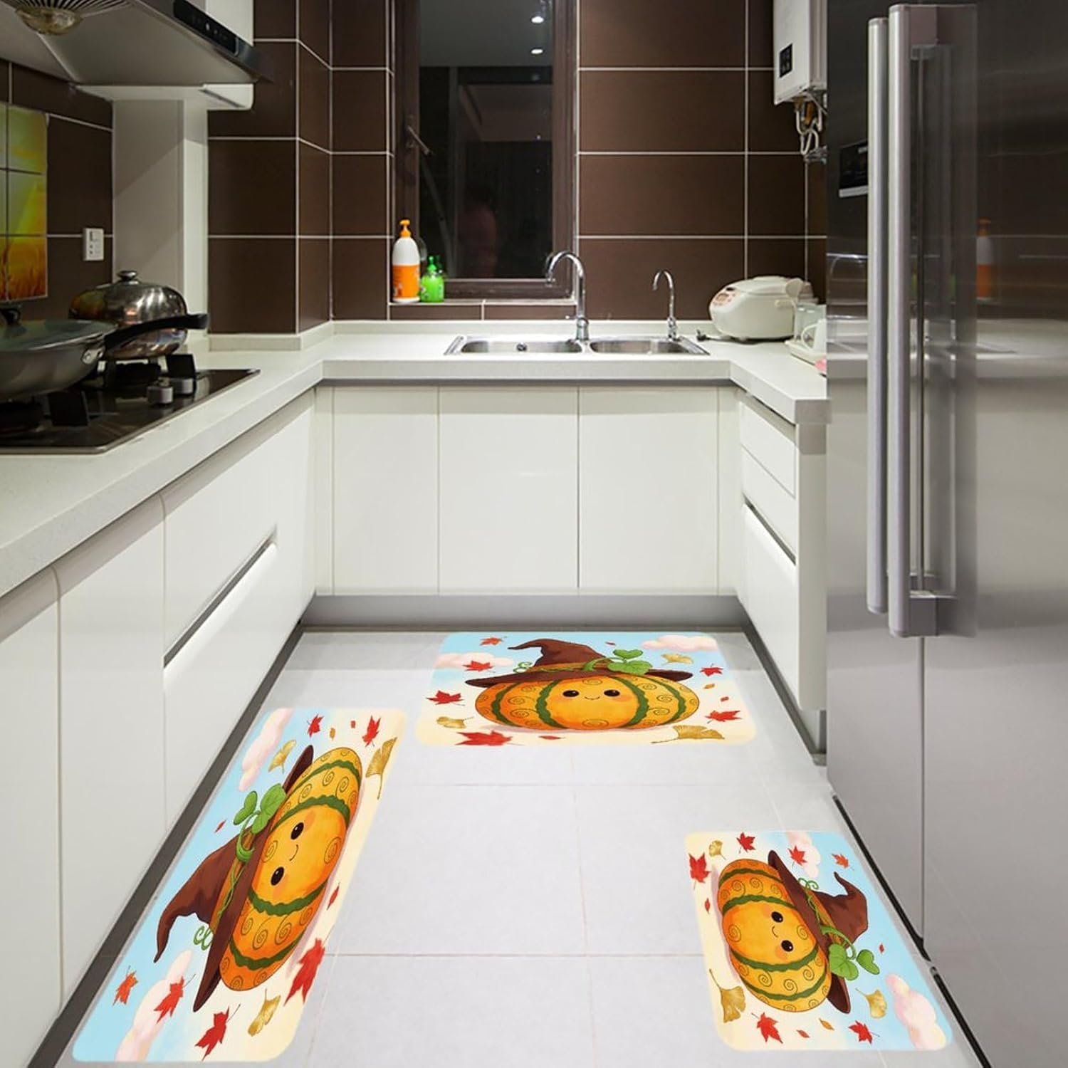 Transform your living spaces with this essential Autumn Pumpkin three-piece set of mats,designed to merge everyday function with effortless style.These washable kitchen mats,crafted from a distinctive Fiber Flannel,introduce a layer of plush softness that welcomes you from the first step.Imagine the comfort of natural,thickened fibers underfoot as you move through your daily routines,whether you're preparing a meal or freshening up.The set's versatile design allows it to adapt beautifully,serving equally well as farmhouse bathroom rugs or soft entryway runner rugs,proving that comfort should have no single address.Beyond their immediate comfort,these mats are conceived for real-life ease and adaptability.As dedicated anti fatigue Autumn Pumpkin kitchen mats for floor areas,they provide a forgiving surface during prolonged tasks.Need a reliable carpet for sink areas to catch drips and spills?This set has you covered.You can freely place them in moisture areas or traffic zones,knowing their performance remains consistent.These are more than mere kitchen utensils;they are subtle yet impactful seasonal home Autumn Pumpkin decor mats.Change the feel of your space by rotating them or moving them from a spring kitchen carpets setup to a cozy autumn nook.Their cohesive look ties different areas together,enhancing the overall beauty and warmth of your interior.Their breathable and gentle texture makes them a reliable companion in any room,offering a consistently pleasant foundation.
