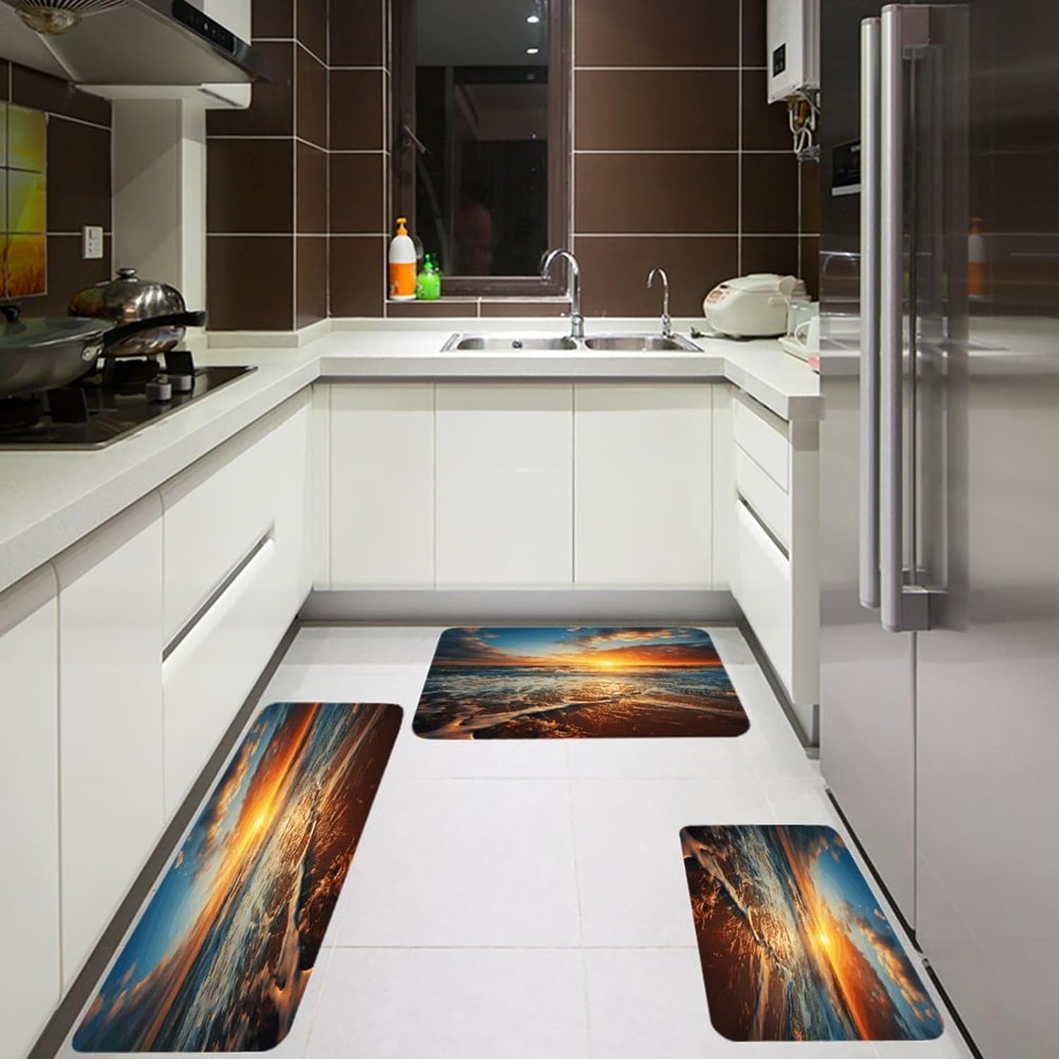 Introduce a new level of ease and visual harmony to your culinary space with this essential three-piece Ocean Sunrise kitchen mat set.Designed specifically for use areas,these cushioned kitchen rugs provide a welcome layer of support right where you need it most–in front of the sink,stove,or prep counter.the fabric offers a plush,dense texture underfoot,making standing tasks noticeably more comfortable.The set functions perfectly as versatile kitchen area rug solutions,fitting seamlessly into your existing layout.The core of these anti fatigue Ocean Sunrise kitchen rug sets lies in the selected velvet material.This fabric choice delivers both the sought-after softness and a practical thickness that gently cushions your feet,helping to alleviate the tiredness that comes with long cooking sessions.Beyond comfort,maintenance is refreshingly simple;they are washable kitchen mats designed to maintain their appearance through regular cleaning.Extend the utility and aesthetic charm beyond just the kitchen.The soft Ocean Sunrise kitchen runner rugs design and quality construction make them adaptable companions for other areas like the bathroom vanity or even outdoor patio setups where a comfortable floor mat is desired.Arrange the three pieces to create a cohesive runner effect or use them individually as targeted floor mats where support is needed.This set effectively combines practical comfort,effortless care with its washable nature,and an attractive upgrade to your floor space,making it a smart addition to any home.