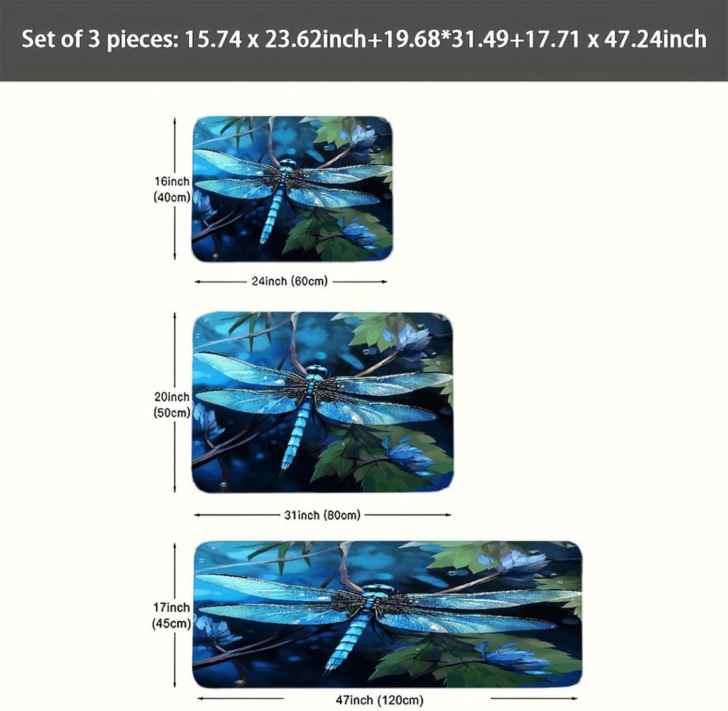 Introduce a new level of ease and visual harmony to your culinary space with this essential three-piece Art Blue Dragonfly kitchen mat set.Designed specifically for use areas,these cushioned kitchen rugs provide a welcome layer of support right where you need it most–in front of the sink,stove,or prep counter.the fabric offers a plush,dense texture underfoot,making standing tasks noticeably more comfortable.The set functions perfectly as versatile kitchen area rug solutions,fitting seamlessly into your existing layout.The core of these anti fatigue Art Blue Dragonfly kitchen rug sets lies in the selected velvet material.This fabric choice delivers both the sought-after softness and a practical thickness that gently cushions your feet,helping to alleviate the tiredness that comes with long cooking sessions.Beyond comfort,maintenance is refreshingly simple;they are washable kitchen mats designed to maintain their appearance through regular cleaning.Extend the utility and aesthetic charm beyond just the kitchen.The soft Art Blue Dragonfly kitchen runner rugs design and quality construction make them adaptable companions for other areas like the bathroom vanity or even outdoor patio setups where a comfortable floor mat is desired.Arrange the three pieces to create a cohesive runner effect or use them individually as targeted floor mats where support is needed.This set effectively combines practical comfort,effortless care with its washable nature,and an attractive upgrade to your floor space,making it a smart addition to any home.