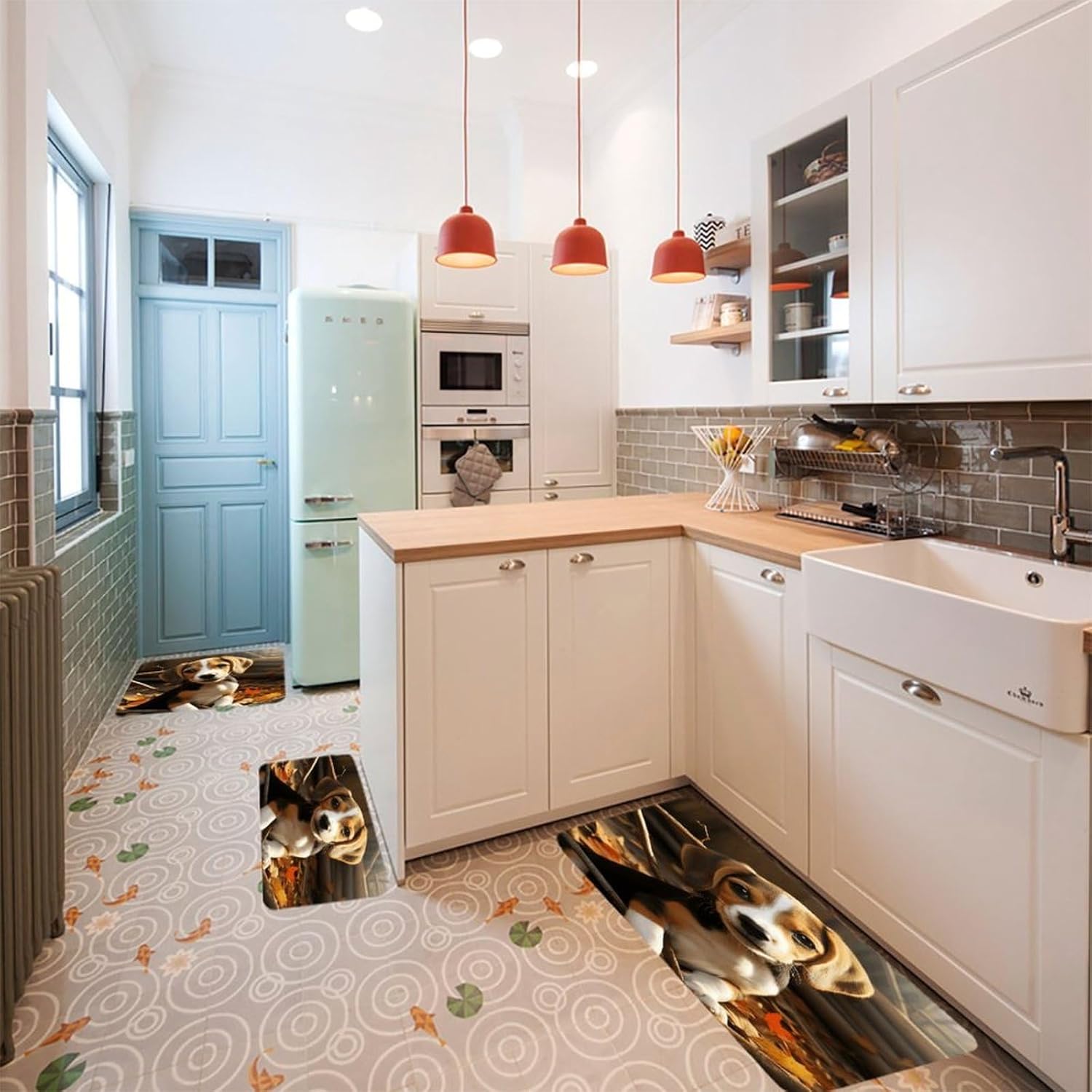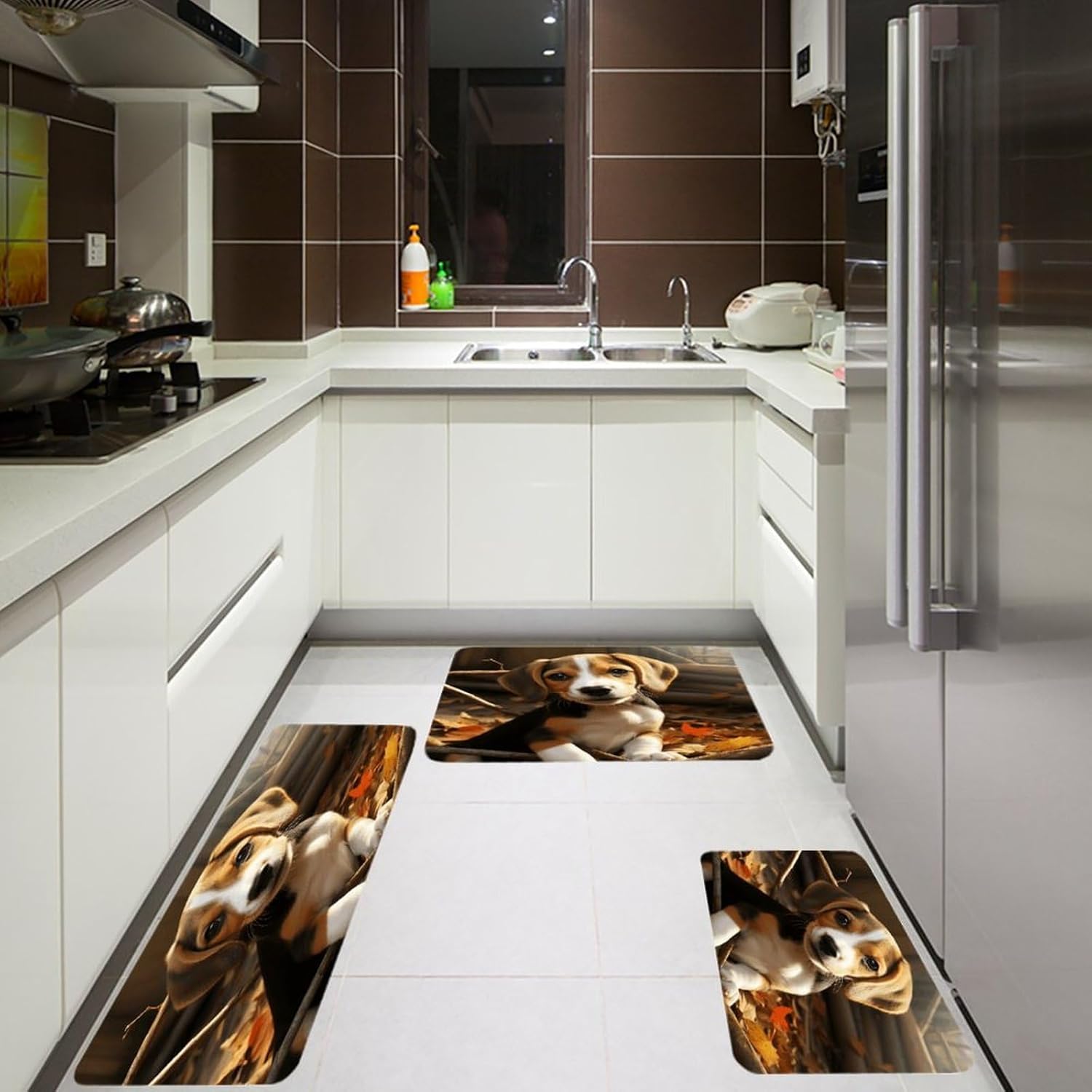 Introduce a new level of ease and visual harmony to your culinary space with this essential three-piece Cute Beagle kitchen mat set.Designed specifically for use areas,these cushioned kitchen rugs provide a welcome layer of support right where you need it most–in front of the sink,stove,or prep counter.the fabric offers a plush,dense texture underfoot,making standing tasks noticeably more comfortable.The set functions perfectly as versatile kitchen area rug solutions,fitting seamlessly into your existing layout.The core of these anti fatigue Cute Beagle kitchen rug sets lies in the selected velvet material.This fabric choice delivers both the sought-after softness and a practical thickness that gently cushions your feet,helping to alleviate the tiredness that comes with long cooking sessions.Beyond comfort,maintenance is refreshingly simple;they are washable kitchen mats designed to maintain their appearance through regular cleaning.Extend the utility and aesthetic charm beyond just the kitchen.The soft Cute Beagle kitchen runner rugs design and quality construction make them adaptable companions for other areas like the bathroom vanity or even outdoor patio setups where a comfortable floor mat is desired.Arrange the three pieces to create a cohesive runner effect or use them individually as targeted floor mats where support is needed.This set effectively combines practical comfort,effortless care with its washable nature,and an attractive upgrade to your floor space,making it a smart addition to any home.