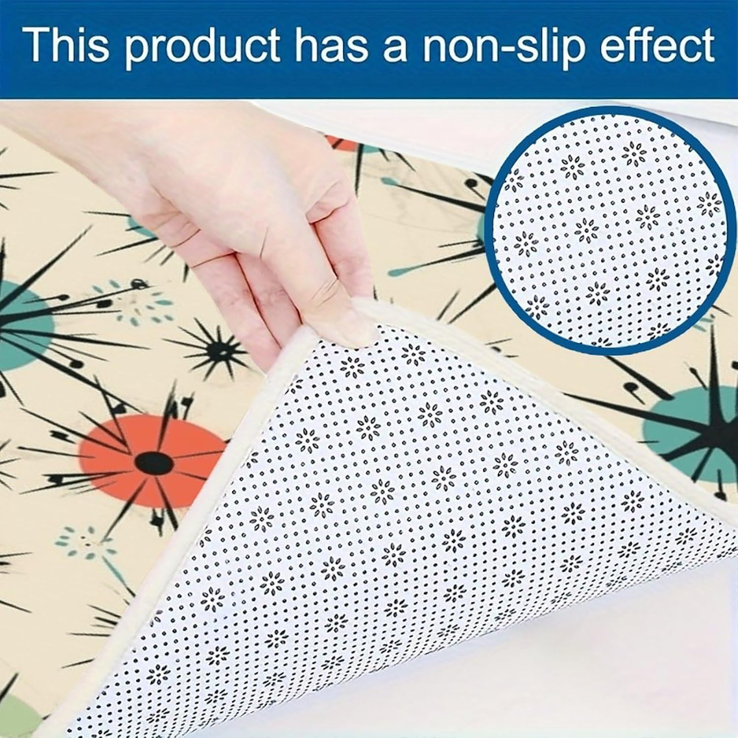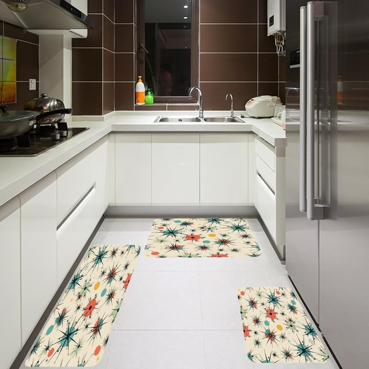 Introduce a new level of ease and visual harmony to your culinary space with this essential three-piece Atomic Stars Retro Pattern kitchen mat set.Designed specifically for use areas,these cushioned kitchen rugs provide a welcome layer of support right where you need it most–in front of the sink,stove,or prep counter.the fabric offers a plush,dense texture underfoot,making standing tasks noticeably more comfortable.The set functions perfectly as versatile kitchen area rug solutions,fitting seamlessly into your existing layout.The core of these anti fatigue Atomic Stars Retro Pattern kitchen rug sets lies in the selected velvet material.This fabric choice delivers both the sought-after softness and a practical thickness that gently cushions your feet,helping to alleviate the tiredness that comes with long cooking sessions.Beyond comfort,maintenance is refreshingly simple;they are washable kitchen mats designed to maintain their appearance through regular cleaning.Extend the utility and aesthetic charm beyond just the kitchen.The soft Atomic Stars Retro Pattern kitchen runner rugs design and quality construction make them adaptable companions for other areas like the bathroom vanity or even outdoor patio setups where a comfortable floor mat is desired.Arrange the three pieces to create a cohesive runner effect or use them individually as targeted floor mats where support is needed.This set effectively combines practical comfort,effortless care with its washable nature,and an attractive upgrade to your floor space,making it a smart addition to any home.