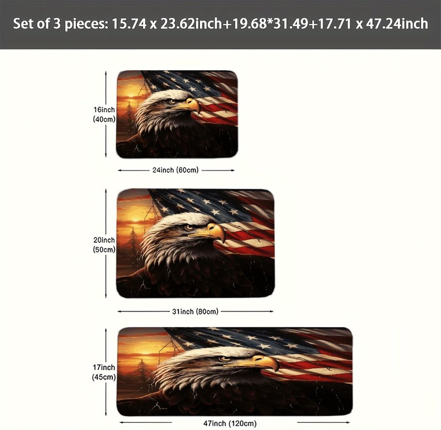 Introduce a new level of ease and visual harmony to your culinary space with this essential three-piece Flag And Eagle kitchen mat set.Designed specifically for use areas,these cushioned kitchen rugs provide a welcome layer of support right where you need it most–in front of the sink,stove,or prep counter.the fabric offers a plush,dense texture underfoot,making standing tasks noticeably more comfortable.The set functions perfectly as versatile kitchen area rug solutions,fitting seamlessly into your existing layout.The core of these anti fatigue Flag And Eagle kitchen rug sets lies in the selected velvet material.This fabric choice delivers both the sought-after softness and a practical thickness that gently cushions your feet,helping to alleviate the tiredness that comes with long cooking sessions.Beyond comfort,maintenance is refreshingly simple;they are washable kitchen mats designed to maintain their appearance through regular cleaning.Extend the utility and aesthetic charm beyond just the kitchen.The soft Flag And Eagle kitchen runner rugs design and quality construction make them adaptable companions for other areas like the bathroom vanity or even outdoor patio setups where a comfortable floor mat is desired.Arrange the three pieces to create a cohesive runner effect or use them individually as targeted floor mats where support is needed.This set effectively combines practical comfort,effortless care with its washable nature,and an attractive upgrade to your floor space,making it a smart addition to any home.