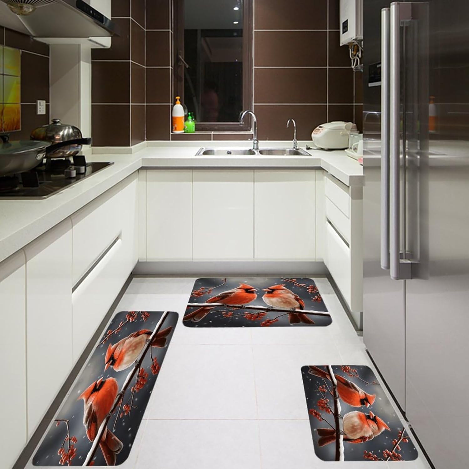 Introduce a new level of ease and visual harmony to your culinary space with this essential three-piece Cute Cardinal Birds kitchen mat set.Designed specifically for use areas,these cushioned kitchen rugs provide a welcome layer of support right where you need it most–in front of the sink,stove,or prep counter.the fabric offers a plush,dense texture underfoot,making standing tasks noticeably more comfortable.The set functions perfectly as versatile kitchen area rug solutions,fitting seamlessly into your existing layout.The core of these anti fatigue Cute Cardinal Birds kitchen rug sets lies in the selected velvet material.This fabric choice delivers both the sought-after softness and a practical thickness that gently cushions your feet,helping to alleviate the tiredness that comes with long cooking sessions.Beyond comfort,maintenance is refreshingly simple;they are washable kitchen mats designed to maintain their appearance through regular cleaning.Extend the utility and aesthetic charm beyond just the kitchen.The soft Cute Cardinal Birds kitchen runner rugs design and quality construction make them adaptable companions for other areas like the bathroom vanity or even outdoor patio setups where a comfortable floor mat is desired.Arrange the three pieces to create a cohesive runner effect or use them individually as targeted floor mats where support is needed.This set effectively combines practical comfort,effortless care with its washable nature,and an attractive upgrade to your floor space,making it a smart addition to any home.
