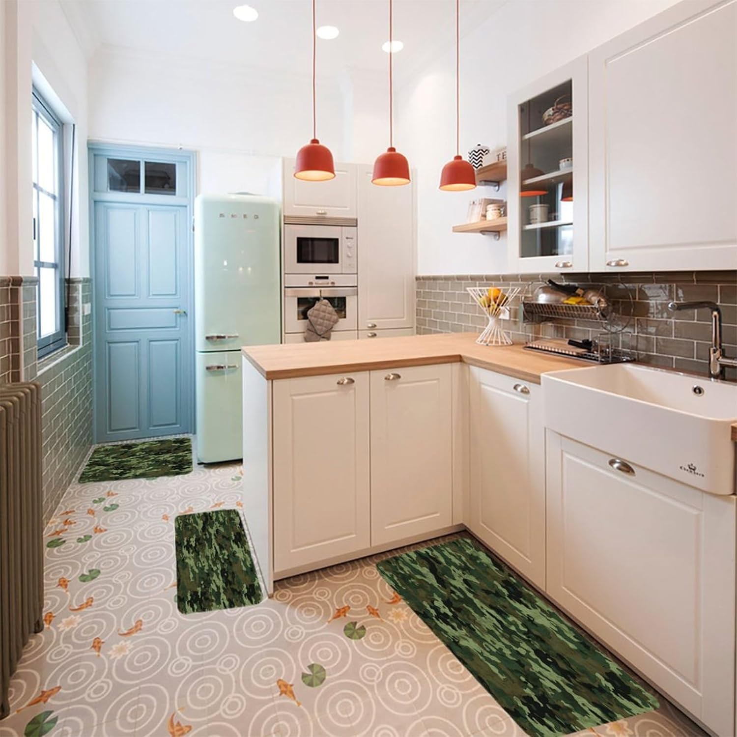 Introduce a new level of ease and visual harmony to your culinary space with this essential three-piece Green Military Camo kitchen mat set.Designed specifically for use areas,these cushioned kitchen rugs provide a welcome layer of support right where you need it most–in front of the sink,stove,or prep counter.the fabric offers a plush,dense texture underfoot,making standing tasks noticeably more comfortable.The set functions perfectly as versatile kitchen area rug solutions,fitting seamlessly into your existing layout.The core of these anti fatigue Green Military Camo kitchen rug sets lies in the selected velvet material.This fabric choice delivers both the sought-after softness and a practical thickness that gently cushions your feet,helping to alleviate the tiredness that comes with long cooking sessions.Beyond comfort,maintenance is refreshingly simple;they are washable kitchen mats designed to maintain their appearance through regular cleaning.Extend the utility and aesthetic charm beyond just the kitchen.The soft Green Military Camo kitchen runner rugs design and quality construction make them adaptable companions for other areas like the bathroom vanity or even outdoor patio setups where a comfortable floor mat is desired.Arrange the three pieces to create a cohesive runner effect or use them individually as targeted floor mats where support is needed.This set effectively combines practical comfort,effortless care with its washable nature,and an attractive upgrade to your floor space,making it a smart addition to any home.