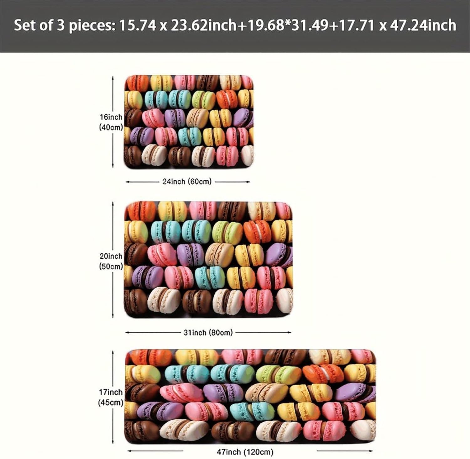 Introduce a new level of ease and visual harmony to your culinary space with this essential three-piece Macaron Biscuit Flavored Pastries kitchen mat set.Designed specifically for use areas,these cushioned kitchen rugs provide a welcome layer of support right where you need it most–in front of the sink,stove,or prep counter.the fabric offers a plush,dense texture underfoot,making standing tasks noticeably more comfortable.The set functions perfectly as versatile kitchen area rug solutions,fitting seamlessly into your existing layout.The core of these anti fatigue Macaron Biscuit Flavored Pastries kitchen rug sets lies in the selected velvet material.This fabric choice delivers both the sought-after softness and a practical thickness that gently cushions your feet,helping to alleviate the tiredness that comes with long cooking sessions.Beyond comfort,maintenance is refreshingly simple;they are washable kitchen mats designed to maintain their appearance through regular cleaning.Extend the utility and aesthetic charm beyond just the kitchen.The soft Macaron Biscuit Flavored Pastries kitchen runner rugs design and quality construction make them adaptable companions for other areas like the bathroom vanity or even outdoor patio setups where a comfortable floor mat is desired.Arrange the three pieces to create a cohesive runner effect or use them individually as targeted floor mats where support is needed.This set effectively combines practical comfort,effortless care with its washable nature,and an attractive upgrade to your floor space,making it a smart addition to any home.
