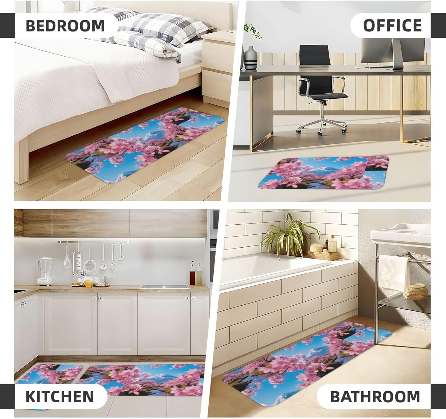 Kitchen Rugs and Mats, Anti Fatigue Comfort Standing Kitchen Runner Mat Snowy Fuji & Pink Bloom Kitchen Floor Mat 2 Sets Boho Kitchen Rug for Kitchen Decor Floor Mat Runner Carpet for Hallways Farmhouse Kitchen Mat, Cushioned Anti Fatigue Kitchen Mats for Floor, Non Slip Rugs for Kitchen Floor, Snowy Fuji & Pink Bloom Kitchen Mat Anti Fatigue Cushioned, Memory Foam Padded Standing Rug Washable, Non Slip Comfort Floor Runner for Home, Sink, Laundry, Office Cushioned Kitchen Mats for FloorSize: The set contains 2 rectangular mats (17.3"*29.5"+17.3"*47.2").Durable and non-slip: It's made of PVC material, the grain backing prevent slipping or shifting.Decent design: The simplicity pattern and color make your kitchen more stylish.Multi-purpose: Suitable for laundry, doorway, outdoor, kitchen, foyer, bathroom, etc.Easy to clean: Waterproof material make this anti fatigue mat easy to clean, just wipe it with wet cloth.Stylist Multi-functional Floral Anti Fatigue Kitchen Mats Set: These 2-piece farmhouse kitchen rug set includes a kitchen runner + rectangle kitchen carpet, fitting most kitchen spaces, also suitable as standing desk mat, laundry room rug and runner,office mat,doormat, bedroom rug ,bathroom rug mat, bedroom accent or other anti fatigue mat application, provides a warm accent for the home or kitchen.Also be great gift idea for Thanksgiving,Christmas or any other holiday!