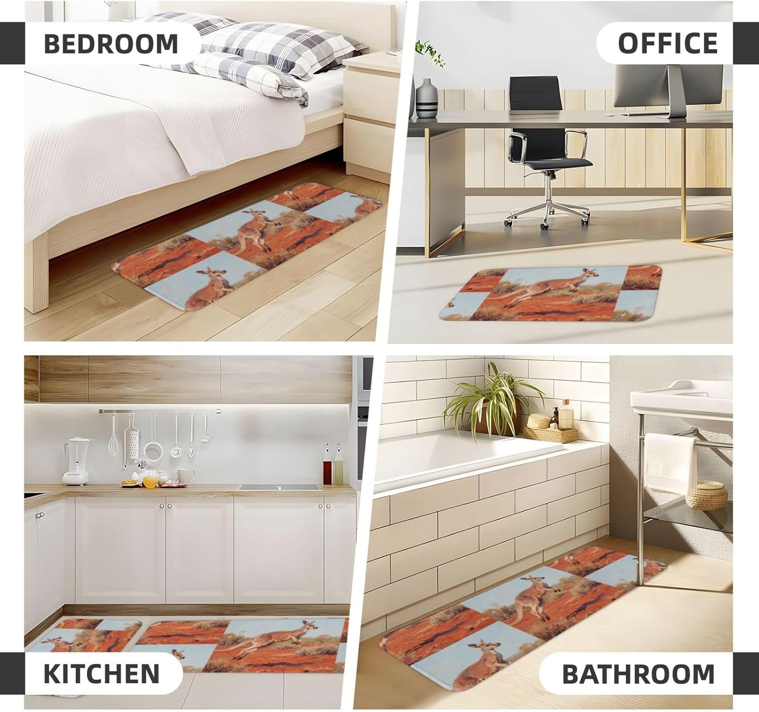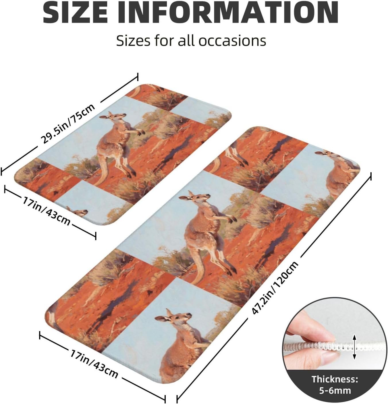 Kitchen Rugs and Mats, Anti Fatigue Comfort Standing Kitchen Runner Mat Jumping Kangaroo Kitchen Floor Mat 2 Sets Boho Kitchen Rug for Kitchen Decor Floor Mat Runner Carpet for Hallways Farmhouse Kitchen Mat, Cushioned Anti Fatigue Kitchen Mats for Floor, Non Slip Rugs for Kitchen Floor, Jumping Kangaroo Kitchen Mat Anti Fatigue Cushioned, Memory Foam Padded Standing Rug Washable, Non Slip Comfort Floor Runner for Home, Sink, Laundry, Office Cushioned Kitchen Mats for FloorSize: The set contains 2 rectangular mats (17.3"*29.5"+17.3"*47.2").Durable and non-slip: It's made of PVC material, the grain backing prevent slipping or shifting.Decent design: The simplicity pattern and color make your kitchen more stylish.Multi-purpose: Suitable for laundry, doorway, outdoor, kitchen, foyer, bathroom, etc.Easy to clean: Waterproof material make this anti fatigue mat easy to clean, just wipe it with wet cloth.Stylist Multi-functional Floral Anti Fatigue Kitchen Mats Set: These 2-piece farmhouse kitchen rug set includes a kitchen runner + rectangle kitchen carpet, fitting most kitchen spaces, also suitable as standing desk mat, laundry room rug and runner,office mat,doormat, bedroom rug ,bathroom rug mat, bedroom accent or other anti fatigue mat application, provides a warm accent for the home or kitchen.Also be great gift idea for Thanksgiving,Christmas or any other holiday!