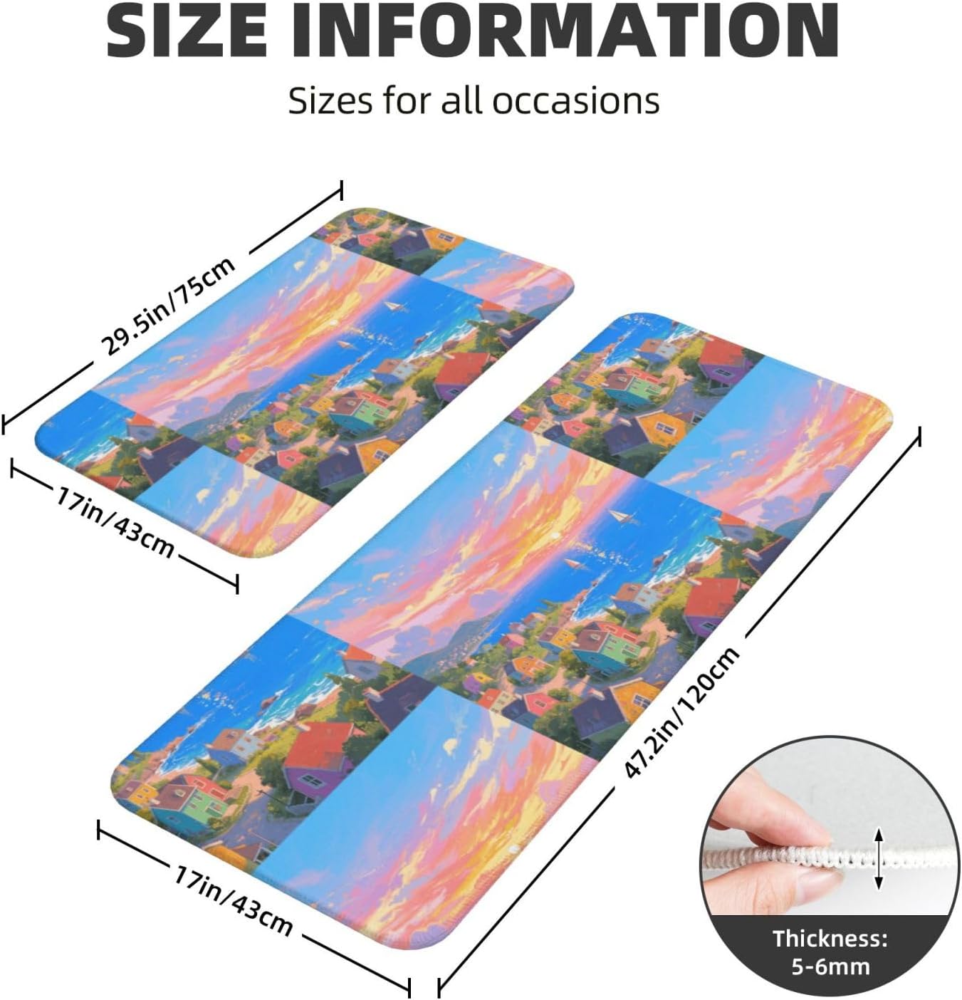 Kitchen Rugs and Mats, Anti Fatigue Comfort Standing Kitchen Runner Mat Seaside Town Kitchen Floor Mat 2 Sets Boho Kitchen Rug for Kitchen Decor Floor Mat Runner Carpet for Hallways Farmhouse Kitchen Mat, Cushioned Anti Fatigue Kitchen Mats for Floor, Non Slip Rugs for Kitchen Floor, Seaside Town Kitchen Mat Anti Fatigue Cushioned, Memory Foam Padded Standing Rug Washable, Non Slip Comfort Floor Runner for Home, Sink, Laundry, Office Cushioned Kitchen Mats for FloorSize: The set contains 2 rectangular mats (17.3"*29.5"+17.3"*47.2").Durable and non-slip: It's made of PVC material, the grain backing prevent slipping or shifting.Decent design: The simplicity pattern and color make your kitchen more stylish.Multi-purpose: Suitable for laundry, doorway, outdoor, kitchen, foyer, bathroom, etc.Easy to clean: Waterproof material make this anti fatigue mat easy to clean, just wipe it with wet cloth.Stylist Multi-functional Floral Anti Fatigue Kitchen Mats Set: These 2-piece farmhouse kitchen rug set includes a kitchen runner + rectangle kitchen carpet, fitting most kitchen spaces, also suitable as standing desk mat, laundry room rug and runner,office mat,doormat, bedroom rug ,bathroom rug mat, bedroom accent or other anti fatigue mat application, provides a warm accent for the home or kitchen.Also be great gift idea for Thanksgiving,Christmas or any other holiday!
