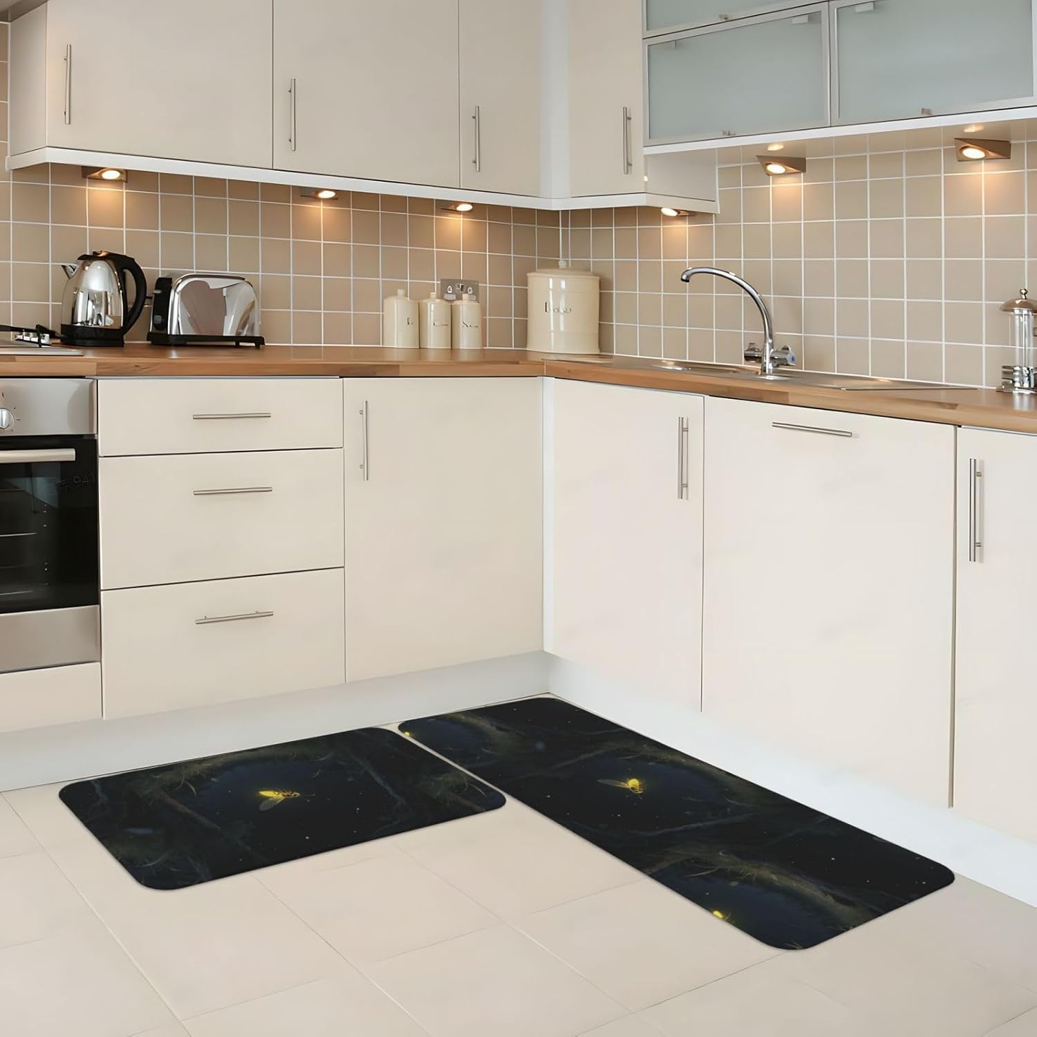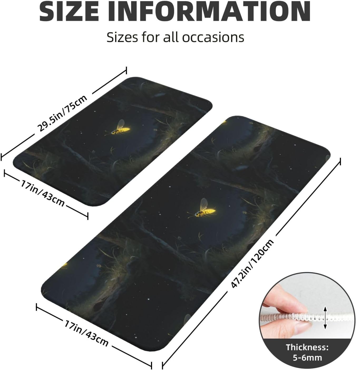 Kitchen Rugs and Mats, Anti Fatigue Comfort Standing Kitchen Runner Mat Firefly Kitchen Floor Mat 2 Sets Boho Kitchen Rug for Kitchen Decor Floor Mat Runner Carpet for Hallways Farmhouse Kitchen Mat, Cushioned Anti Fatigue Kitchen Mats for Floor, Non Slip Rugs for Kitchen Floor, Firefly Kitchen Mat Anti Fatigue Cushioned, Memory Foam Padded Standing Rug Washable, Non Slip Comfort Floor Runner for Home, Sink, Laundry, Office Cushioned Kitchen Mats for FloorSize: The set contains 2 rectangular mats (17.3"*29.5"+17.3"*47.2").Durable and non-slip: It's made of PVC material, the grain backing prevent slipping or shifting.Decent design: The simplicity pattern and color make your kitchen more stylish.Multi-purpose: Suitable for laundry, doorway, outdoor, kitchen, foyer, bathroom, etc.Easy to clean: Waterproof material make this anti fatigue mat easy to clean, just wipe it with wet cloth.Stylist Multi-functional Floral Anti Fatigue Kitchen Mats Set: These 2-piece farmhouse kitchen rug set includes a kitchen runner + rectangle kitchen carpet, fitting most kitchen spaces, also suitable as standing desk mat, laundry room rug and runner,office mat,doormat, bedroom rug ,bathroom rug mat, bedroom accent or other anti fatigue mat application, provides a warm accent for the home or kitchen.Also be great gift idea for Thanksgiving,Christmas or any other holiday!