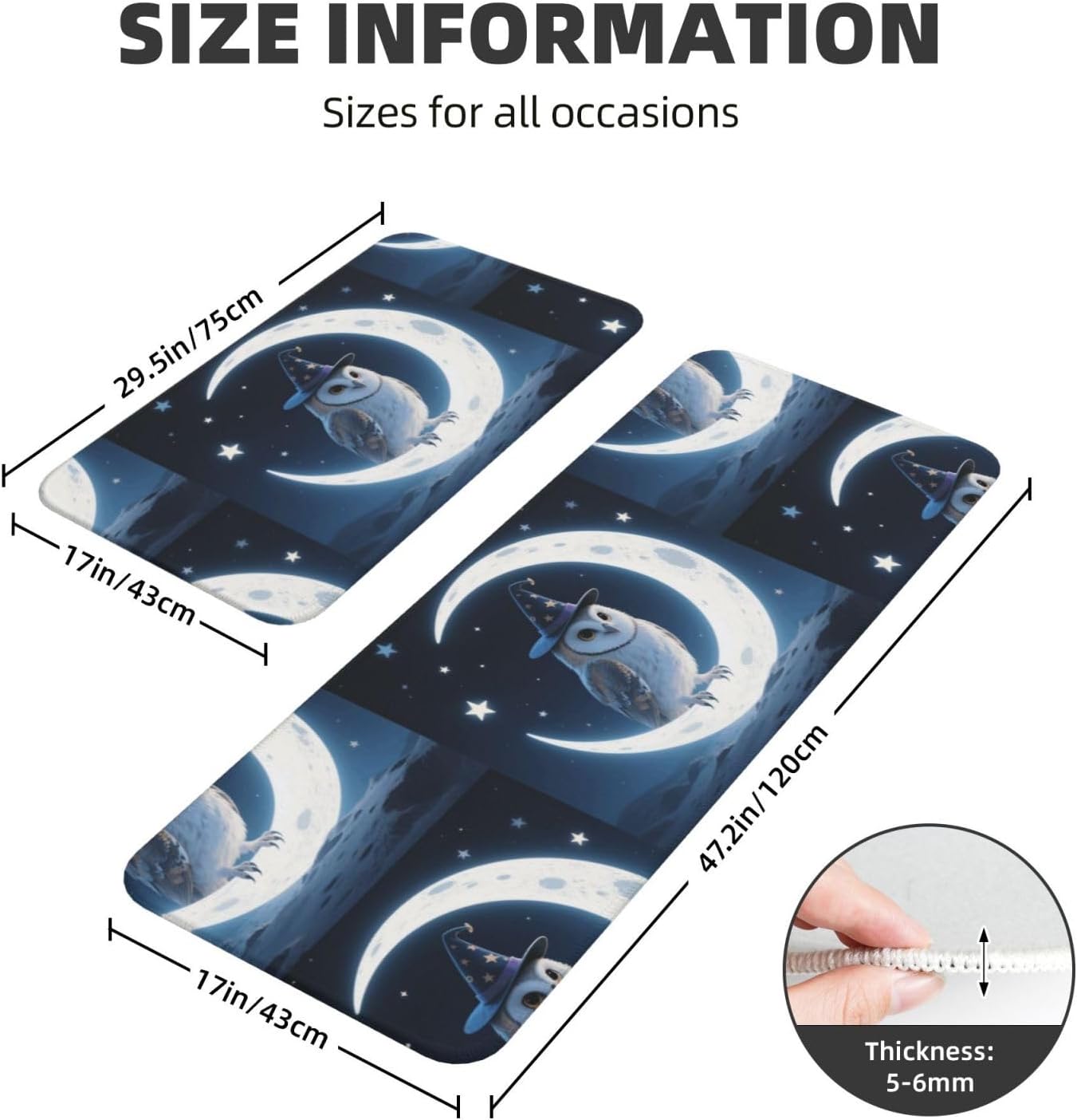 Kitchen Rugs and Mats, Anti Fatigue Comfort Standing Kitchen Runner Mat Magic - Hat Owl Kitchen Floor Mat 2 Sets Boho Kitchen Rug for Kitchen Decor Floor Mat Runner Carpet for Hallways Farmhouse Kitchen Mat, Cushioned Anti Fatigue Kitchen Mats for Floor, Non Slip Rugs for Kitchen Floor, Magic - Hat Owl Kitchen Mat Anti Fatigue Cushioned, Memory Foam Padded Standing Rug Washable, Non Slip Comfort Floor Runner for Home, Sink, Laundry, Office Cushioned Kitchen Mats for FloorSize: The set contains 2 rectangular mats (17.3"*29.5"+17.3"*47.2").Durable and non-slip: It's made of PVC material, the grain backing prevent slipping or shifting.Decent design: The simplicity pattern and color make your kitchen more stylish.Multi-purpose: Suitable for laundry, doorway, outdoor, kitchen, foyer, bathroom, etc.Easy to clean: Waterproof material make this anti fatigue mat easy to clean, just wipe it with wet cloth.Stylist Multi-functional Floral Anti Fatigue Kitchen Mats Set: These 2-piece farmhouse kitchen rug set includes a kitchen runner + rectangle kitchen carpet, fitting most kitchen spaces, also suitable as standing desk mat, laundry room rug and runner,office mat,doormat, bedroom rug ,bathroom rug mat, bedroom accent or other anti fatigue mat application, provides a warm accent for the home or kitchen.Also be great gift idea for Thanksgiving,Christmas or any other holiday!