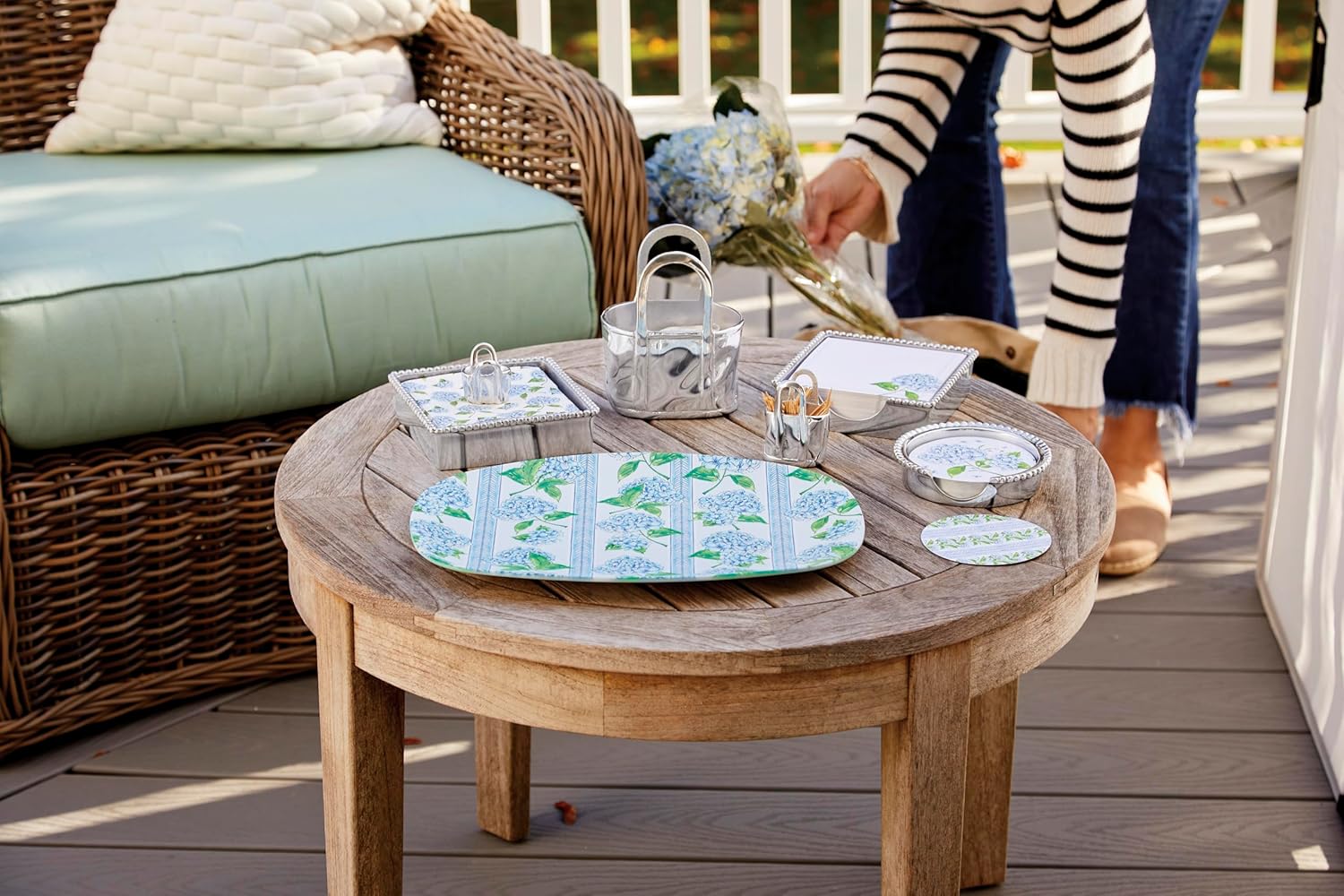 Where floral elegance meets practical sophistication. Add a touch of botanical charm to your entertaining with the Tote Bag Beaded Napkin Box Set. A tote bag napkin weight sits atop of stack of beautiful hydrangea cocktail napkins. Handcrafted from 100% recycled aluminum.
