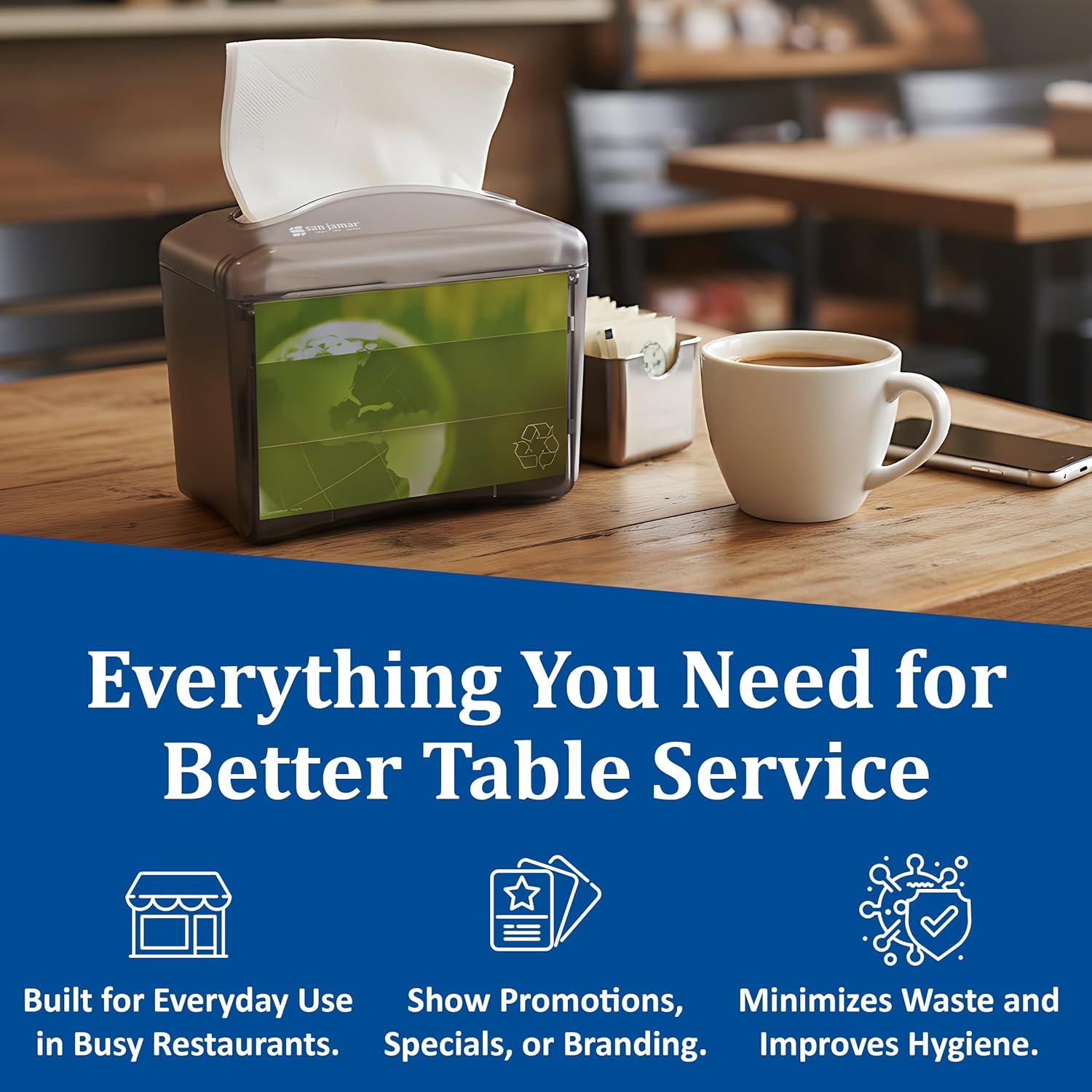 Tabletop venue napkin dispenser featuring the new ad insert feature which increases sales by promoting to customers. The small, compact footprint allows use in multiple venues. Push plate allows for smooth, precise dispensing. New ad insert option, fits 6-1/2" width by 4-1/4" height ad. Black pearl color.