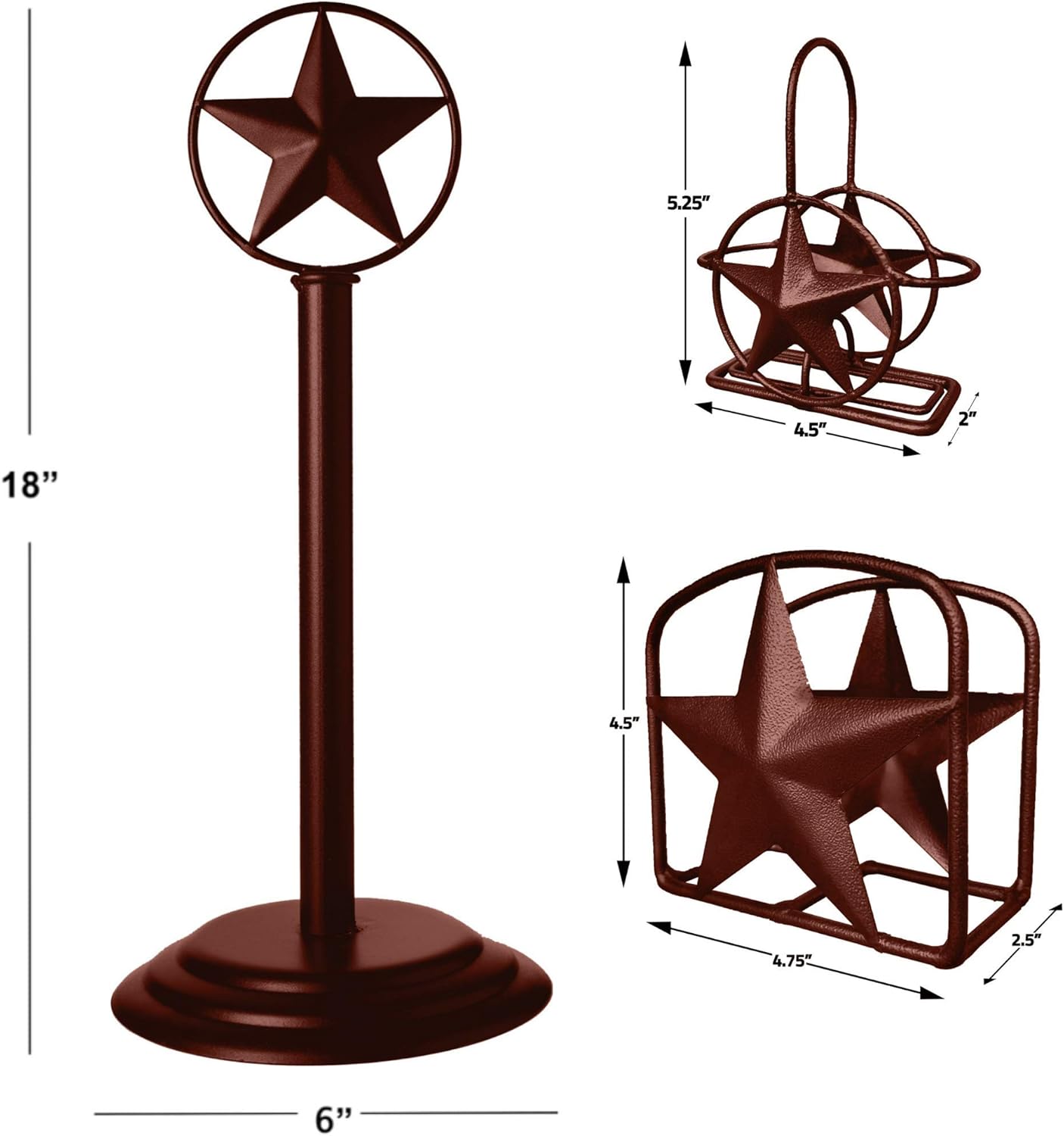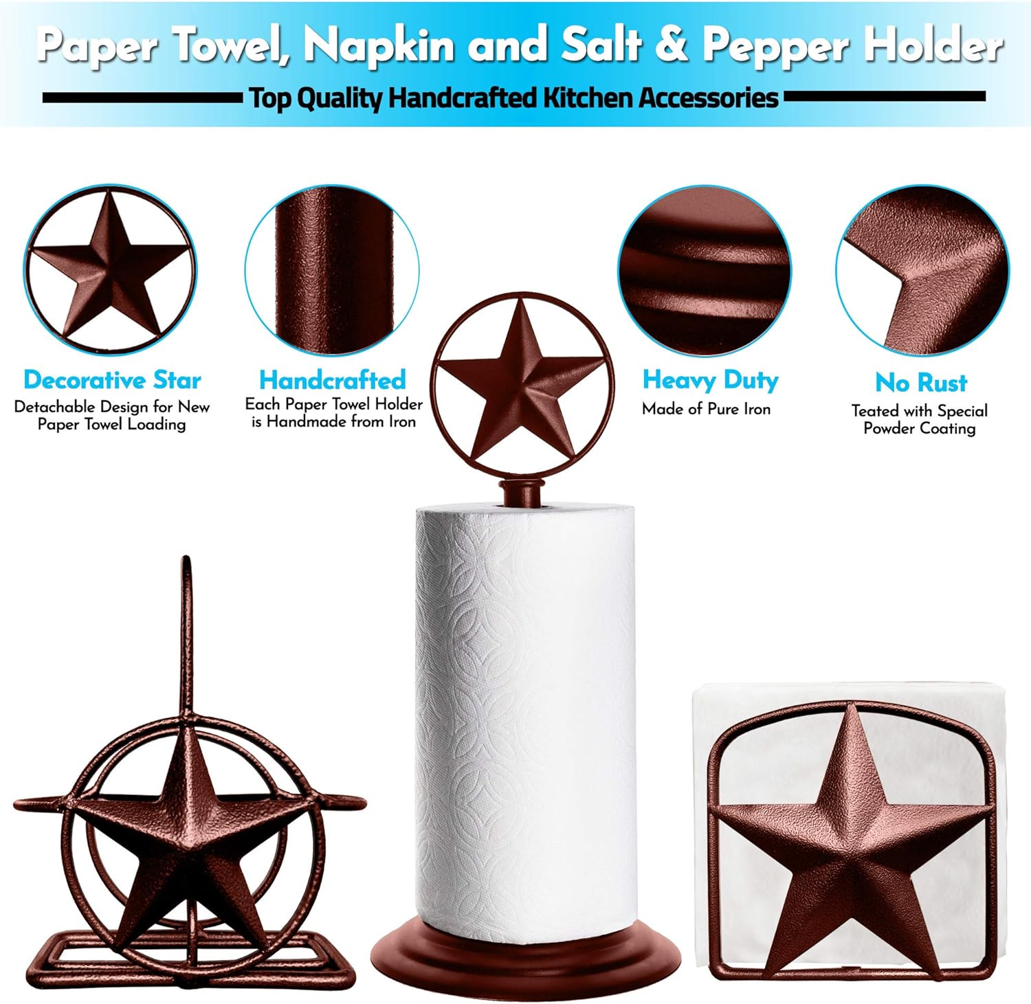 Looking for the perfect rustic country kitchen accessory set? These EcoRise holders are meticulously handcrafted from iron and make for a perfect kitchen accessory decoration! What is included? 1) Paper Towel Holder2) Napkin Holder3) Salt and Pepper Shaker Holder Is any assembly required? No assembly is required! For the paper towel holder, simply pull the star top off in order to load a new paper towel.What material is it made of? These holders are made of heavy-duty iron that is much stronger than other holders made of cheap metal.Do these holders fit all paper towel and napkin sizes? Yes, these holders fit all sizes and brands!