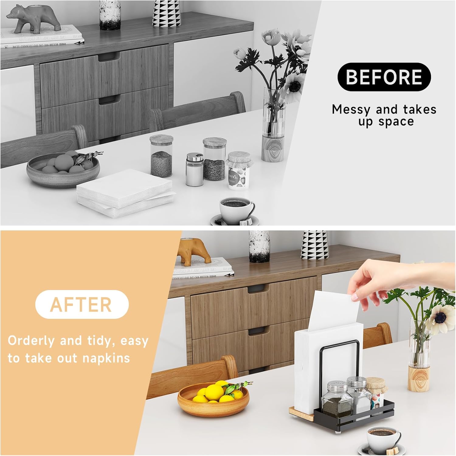 The metal and natural wood design paired brings a touch of modern sophistication and elegance to any dining table or kitchen countertop. Napkin holders for kitchen holds a good amount of napkin without it looking messy, and stores the napkins vertically without taking up too much space. Noteworthy is the additional storage space on a side, sturdy enough to hold salt, pepper shakers and other condiments etc. There are silicone feet on the bottom which prevents scratches and sliding. The surfaces are easy to reach and wipe down, which makes maintaining this that much easier. The napkin holder can be used to store napkins or mail, whatever your preference.