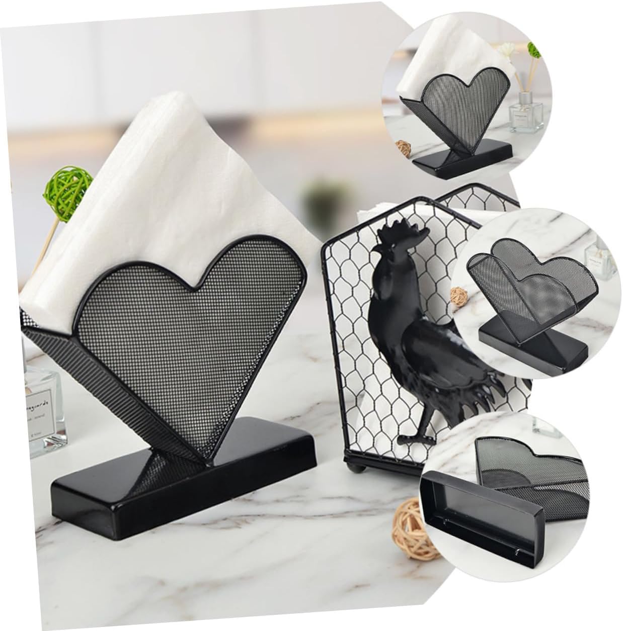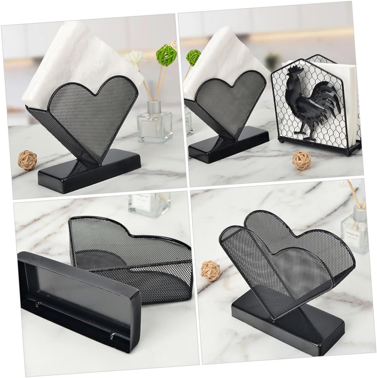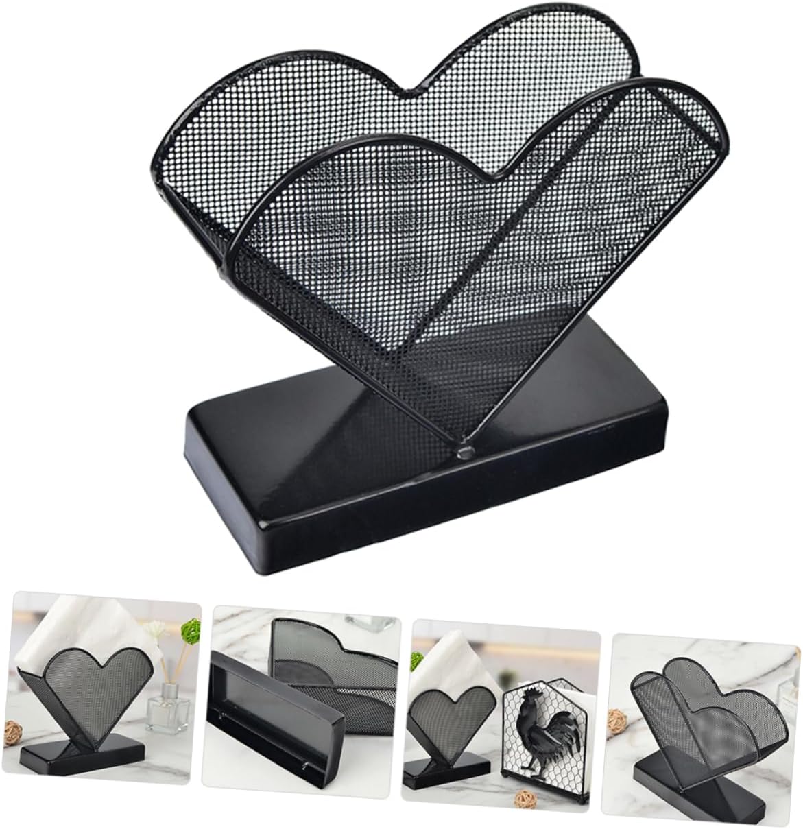 Package Include 1 x Napkin Holder Characteristics -Material:Iron dinner napkin holder -Color:Black retro style napkin stand -Size:16.00X16.00X14.00cm/6.29X6.29X5.50in freestanding tissue holder -Not only can it be used as a paper towel holder, it is also a desktop decoration heart modeling napkin holder. -Napkin Stand can be a housewarming your friends, they will be very happy metal napkin holder. -It is a wonderful accessory for kitchen, hotel or other areas where paper towels are needed napkin holders for cloth napkins. -It has a simple design, but very in use, giving you a using experience restaurant napkin storage rack. -It is for your party, banquet, restaurant, living room, hotel, KTV, bar, etc napkin holder.Goods Informationrack for napkin In addition to being well resistant to daily wear and tear, the charming surface will add decoration to your room.restaurant napkin storage is an accessory in the kitchen, restaurant, dining room and other areas.tissue holder This decorative heart shaped design Napkin Holder, manufactured with , and for a long term use