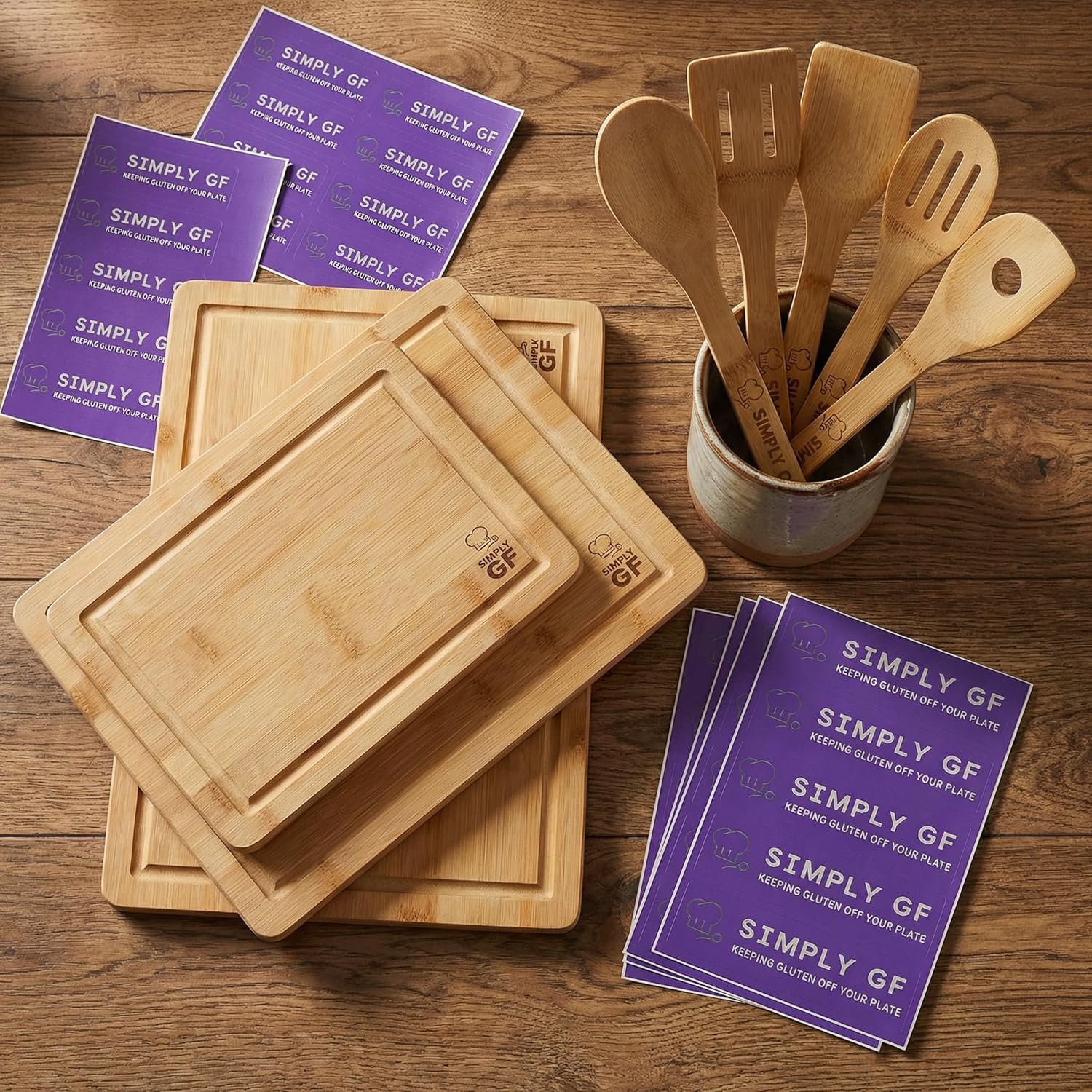 Living gluten-free in a home where not everyone eats the same can feel overwhelming. One spoon in the wrong pot. One board used twice. One unlabeled container. The Simply GF Complete Separation Bundle was created to bring clarity, organization, and confidence back into your kitchen. This combined set gives you both physical separation and visual identification — dedicated bamboo cutting boards and utensils for gluten-free prep, plus 29 clearly printed food storage labels to mark containers throughout your pantry, refrigerator, and freezer. No more guessing. No more second-guessing. No more daily stress around shared kitchen spaces. Designed specifically for mixed-diet households, this bundle helps you create clear gluten-free zones in your kitchen so you can cook with confidence and serve meals with peace of mind. Because gluten-free living shouldn’t feel complicated.