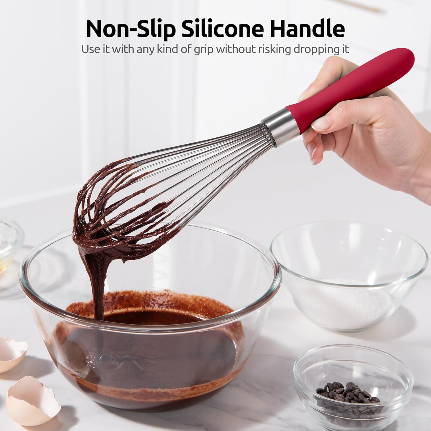 Balloon Whisk:18/10 Stainless Steel Durability: 12in heavy-duty whisk made of 18/10 stainless steel—rust-resistant, anti-bending, even for thick sauces/frostings. 12 high-flex wires (2 more than standard) boost air intake, great for beating eggs, whipping cream, blending dressings.Non-Slip Silicone Handle: Food-grade silicone handle offers secure, non-slip grip (even with wet hands). 12in length for balanced control; sealed handle-wire connection prevents food/water buildup—no hidden dirt or loose parts.Easy Cleaning: Smooth surface + spaced wires mean no sticky residue. Clean with quick rinse or dishwasher; wires don’t retain odors for daily use.Danish Dough Whisk:18/8 Stainless Steel for Baking: 12.6in seamless whisk of 18/8 stainless steel—handles stiff/sticky doughs (sourdough, pizza, cookies) better than wood stirrers. 0.138in thick wire ring resists breakage.3D Ring Efficient Mixing: 3D ring structure glides through ingredients, mixes evenly, reduces splattering. Retains dough texture (avoids overmixing); ideal for wet/dry ingredients, mashed potatoes, baked goods (pancakes, muffins).Hygienic & Dishwasher-Safe: No crevices—no dough/dirt buildup. Dishwasher-safe or quick-rinse clean. Silicone handle for comfort; reinforced handle-wire bond prevents separation, durable for baking.