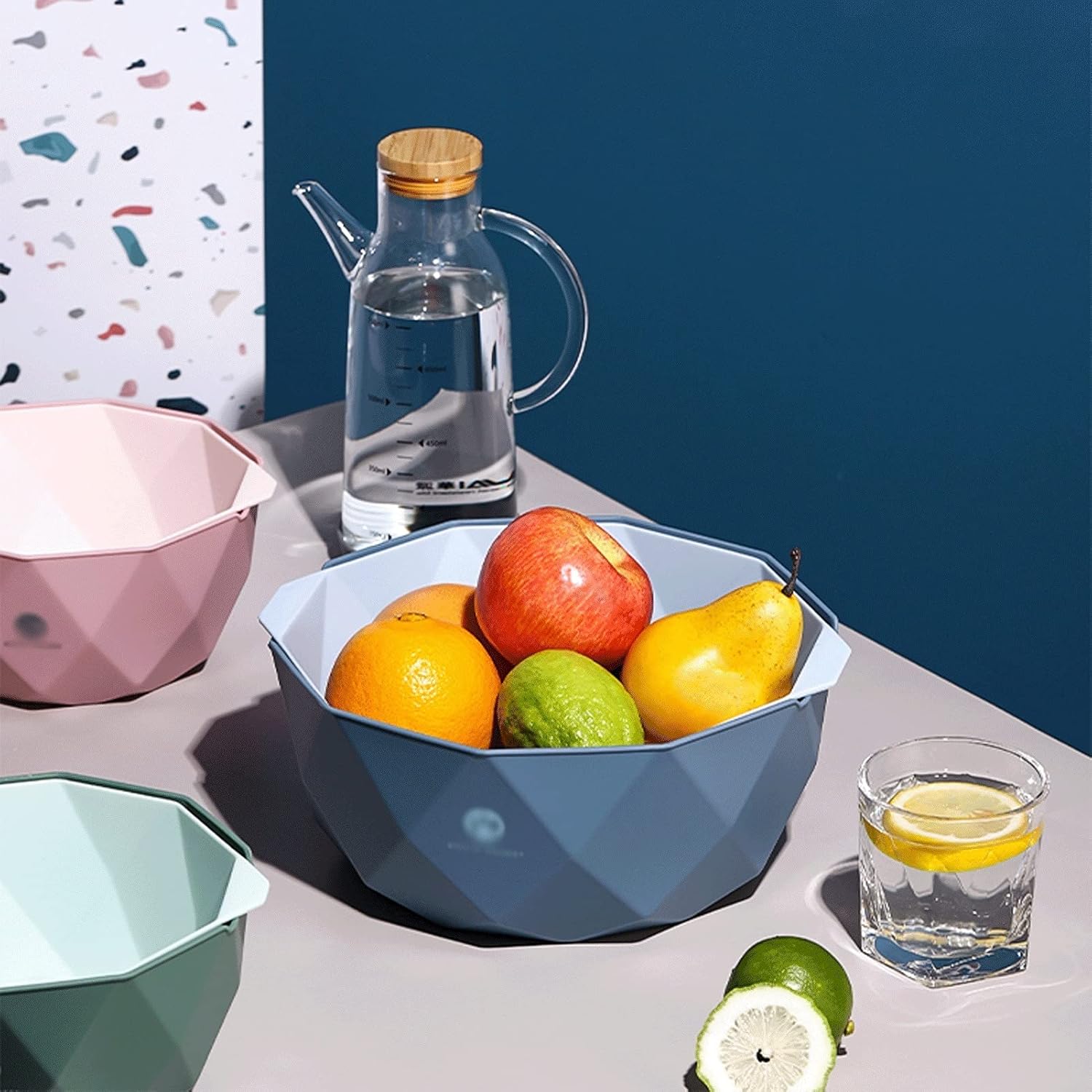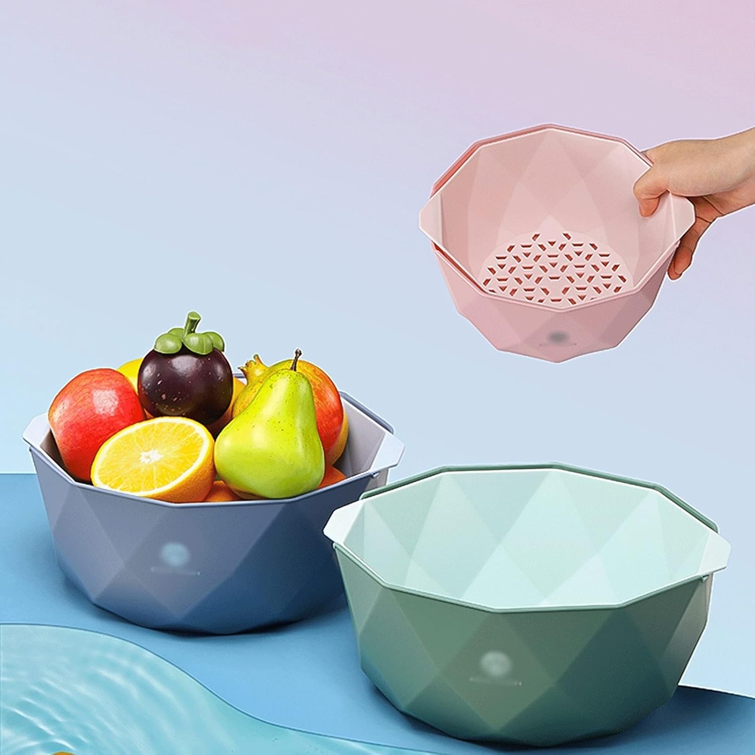 Product name: Strainer and colander setProduct material: plasticColor: green, blue, pinkUses: very suitable for washing vegetables, washing fruits, food storage, fruit plates, etc.Weight:about 205g/330gPackage contents: 1 * 2 in 1 Drain basket with handleNote: Before using for the first time, please clean it with a neutral detergent. Do not approach the fire source to avoid product deformationTip:1. Please note that due to the influence of light and screen, slight chromatic aberration is acceptable. Thank you!2. Please confirm the size and color before buying3. The product photos do not include products other than the product4. Please allow 2-3% difference according to manual measurement, please refer to the actual product, thank you!5. Welcome to share and feedback, we can provide you with better products and services.6. If the product has any quality problems, please feel free to contact us via email, we will solve the problem for you as soon as possible.It makes the countertop storage more convenient and neat, and keeps your dishes away from water drops, it is your perfect kitchen utensils。