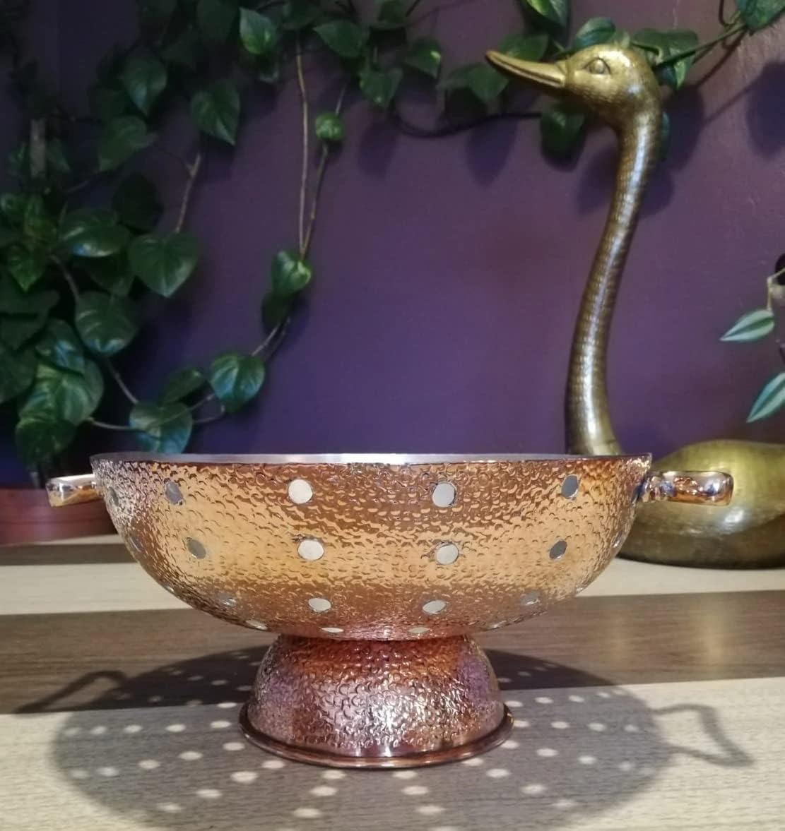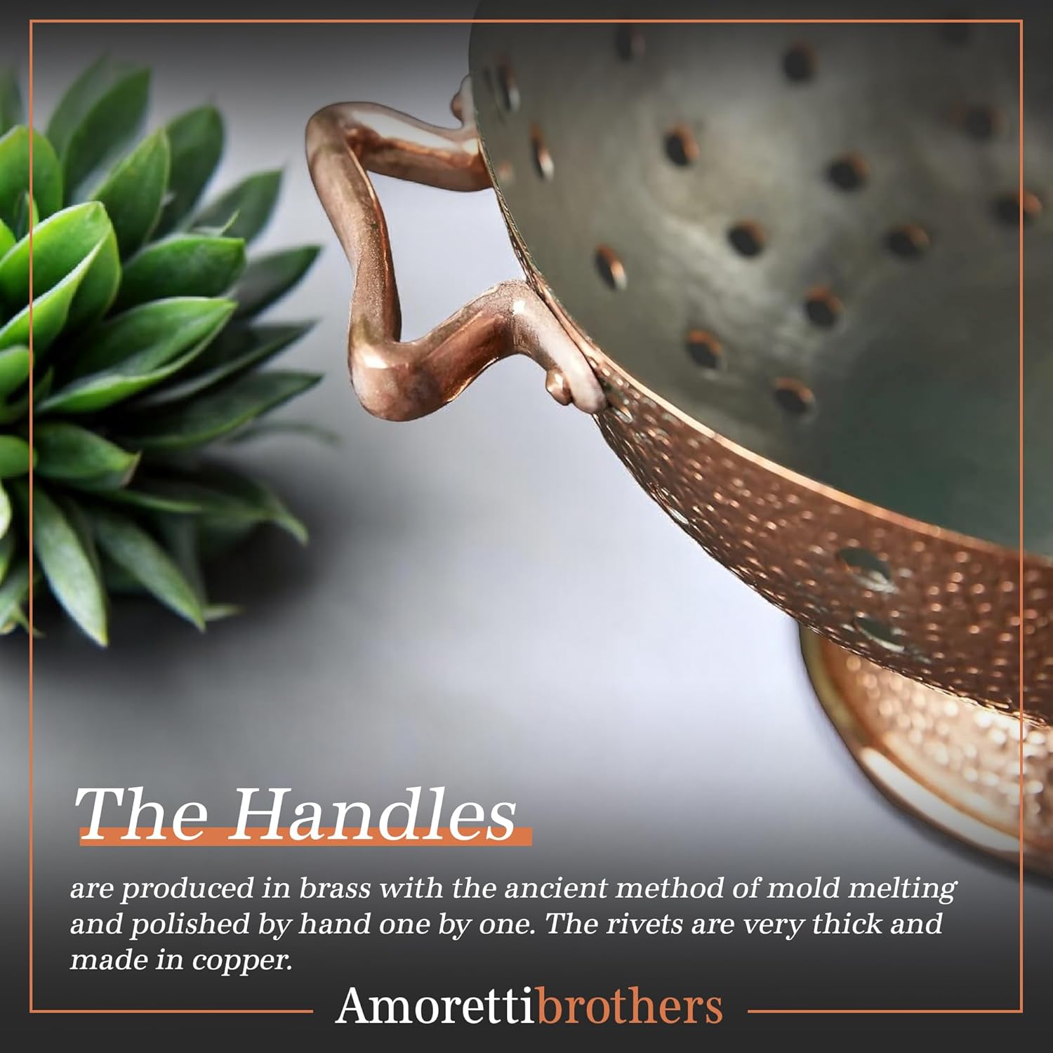 Experience culinary history and craftsmanship with the Amoretti Brothers Handcrafted Food Colander. With roots tracing back to the fall of the Western Roman Empire, this indispensable kitchen tool has evolved into a symbol of gourmet cuisine worldwide. During the Late Middle Ages, the kitchen strainer emerged as a crucial utensil, reflecting urban development, expanding trade, and the rise of the bourgeoisie. Today, our meticulously handcrafted food colander embodies centuries of tradition and innovation. Crafted from solid recycled copper, our food colander features a tin lining for optimal functionality. Its exterior is adorned with hand-hammered dots, adding a unique touch to its design. Functional bronze handles complete its exquisite appearance, marrying beauty with practicality. Versatile and durable, this colander offers a multitude of uses, from straining pasta to mashing vegetables. Chefs and food enthusiasts alike can utilize it to create gourmet cuisine, from purees to sauces. Cleaning is a breeze with our copper cookware set. Simply use a professional copper cleaner for the exterior and wash the tin-lined interior with warm, soapy water. Avoid abrasive tools and corrosive chemicals to preserve the integrity of your cookware. Elevate your culinary experience with the epitome of craftsmanship โ the Amoretti Brothers Handcrafted Food Colander.