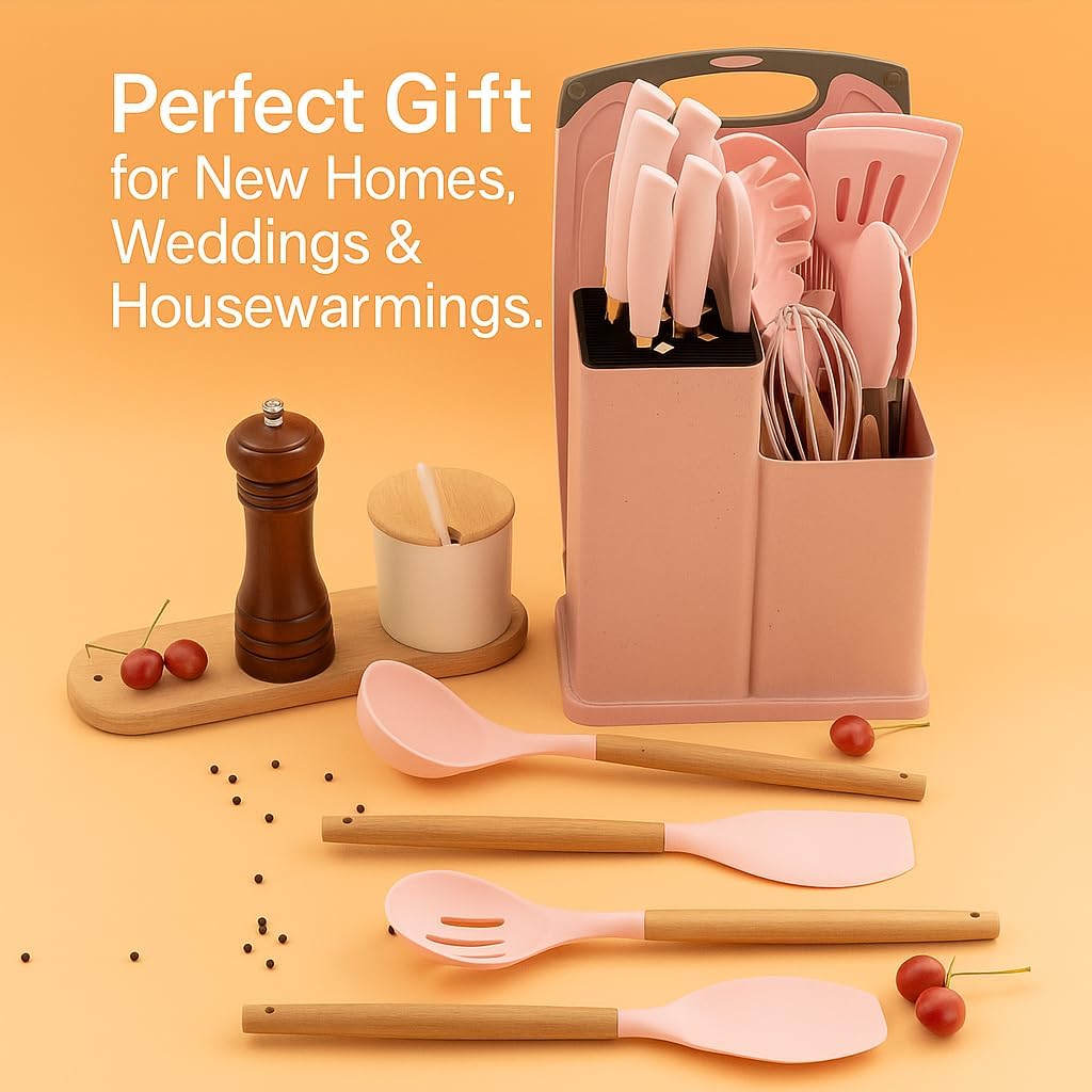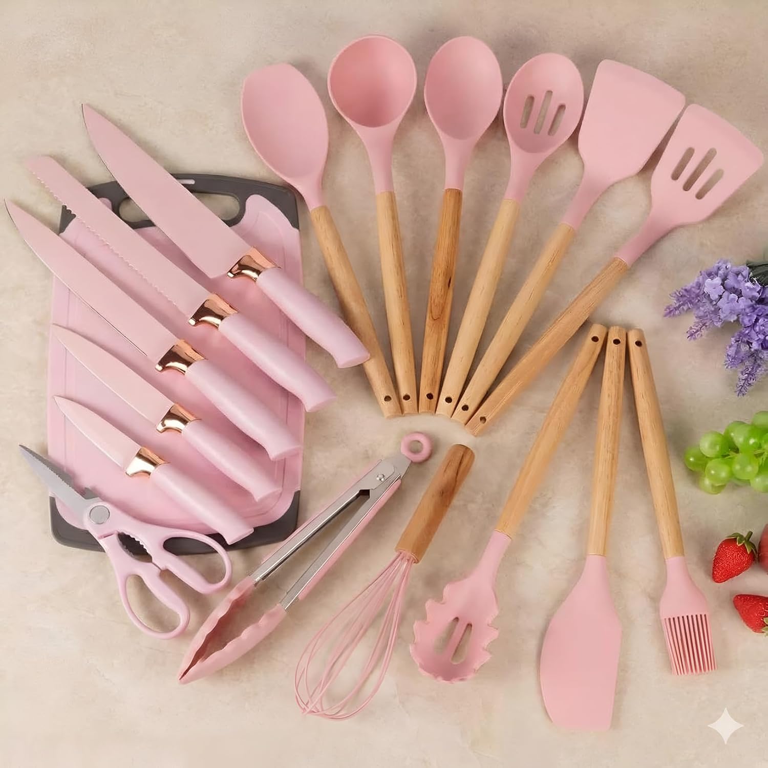 Transform Your Kitchen Experience with Style and Functionality!Meet the DANFFI 19-Piece Pink Kitchen Utensil Set — the perfect blend of elegance and practicality for your everyday cooking needs. Designed for modern homes, this set brings together beauty, durability, and organization in one stylish package.Complete Cooking Arsenal: Includes knives, scissors, spatulas, spoons, tongs, whisk, and a cutting board — all crafted to make chopping, mixing, and serving effortless and enjoyable.Safe, Non-Stick & Heat Resistant: Made from BPA-free, food-grade silicone that can handle up to 446°F / 230°C. Gentle on non-stick cookware, easy to clean, and built for long-lasting performance.Compact & Space-Saving Design: The included Compact Storage Block keeps every tool neatly organized, saving counter space and giving your kitchen a clean, modern look.Elegant Pink Aesthetic: The soft pink tones and wood-style handles create a chic look that complements any kitchen décor. Perfect for those who love a modern, minimalist setup.Perfect Gift for Any Home: Ideal for weddings, housewarmings, or first apartments, this complete pink kitchen utensil set is a thoughtful and practical gift for any cooking enthusiast.Upgrade your kitchen with DANFFI — where design meets performance, and cooking becomes pure joy. Add this elegant set to your cart today and bring a touch of style to every meal!