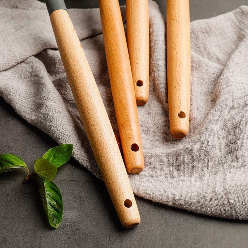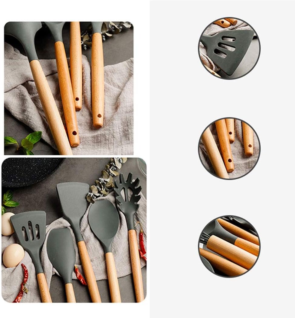 Product Details Product Category: Spoon Shovel Kit Item No.: Silicone kitchenware Product features: simple and beautiful, easy to store, saving time and effort. Color Classification :4 pieces: spatula, soup spoon, leaking shovel, colander Material: Silicone Handle material: beech Features: do not hurt the pot Size: see the picture below Weight: 1kg * Manual measurement error is 0.5-1cm feature: Uses: cooking, soup, fried, etc. Placement: family, kitchen, etc. Precautions Avoid prolonged exposure to hot oil, not suitable for ovens, microwave ovens or direct exposure to open flames. Product packaging: Packing list: spatula *1, soup spoon *1, leaking shovel *1, colander *1