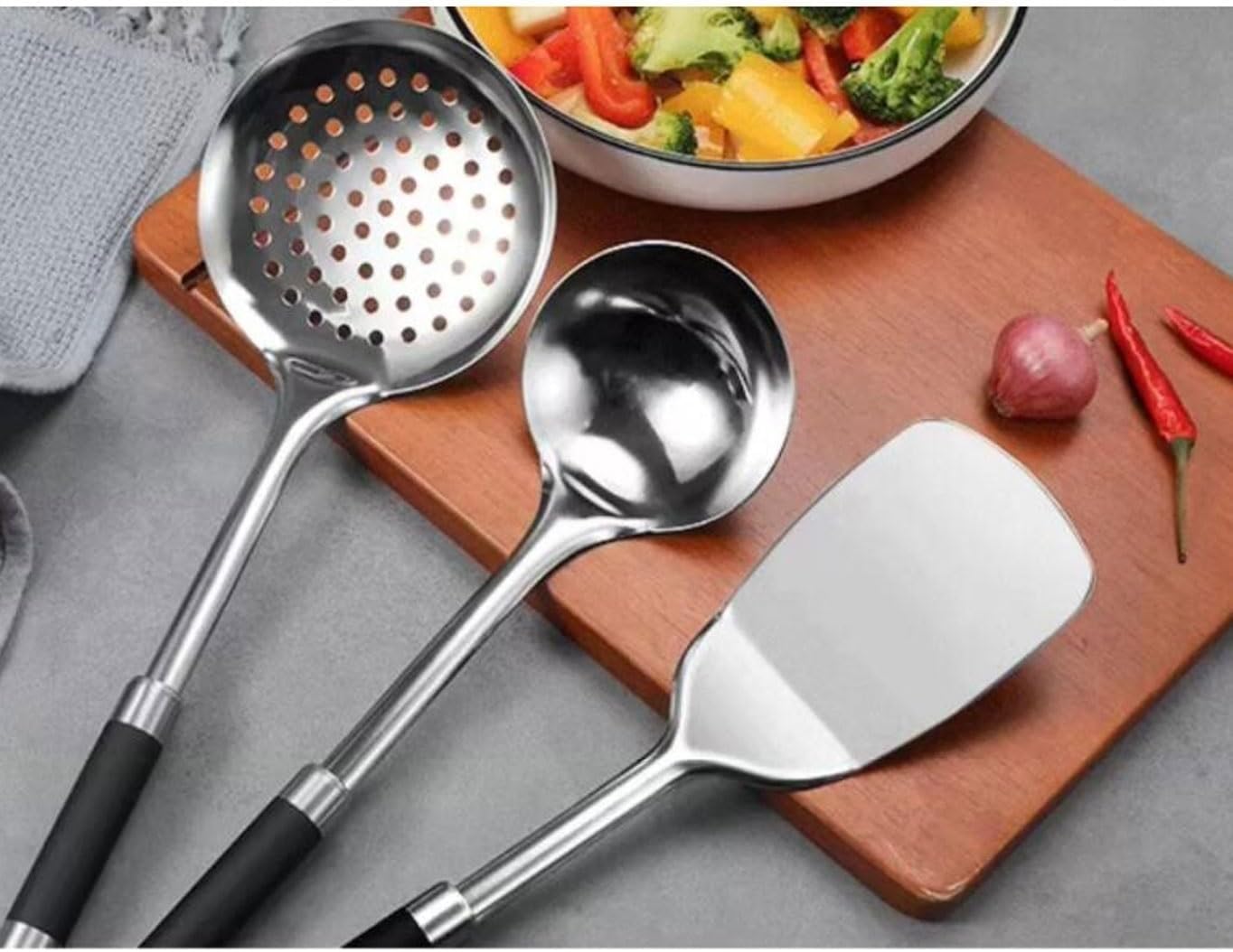 Product Name: Kitchen Tools Spoons for Cooking Spatulas Stainless Steel Cooking Utensils Gadgets 3 Pieces Sets Cookware Dining Exquisite Cooking Utensils, let your life have a style, and can be a gift from-friends and relatives. Material: Stainless Steel. Cooking Utensils Size: Cooking Spoons 31.2*9cm. Slotted Spoons 34.2*11.8cm. Cooking Spatulas 33*8cm. Package: Cooking Spoons * 1 Slotted Spoons * 1 Cooking Spatulas * 1 We assure you that our products will give you satisfaction. If you have any questions about the product, please contact us.