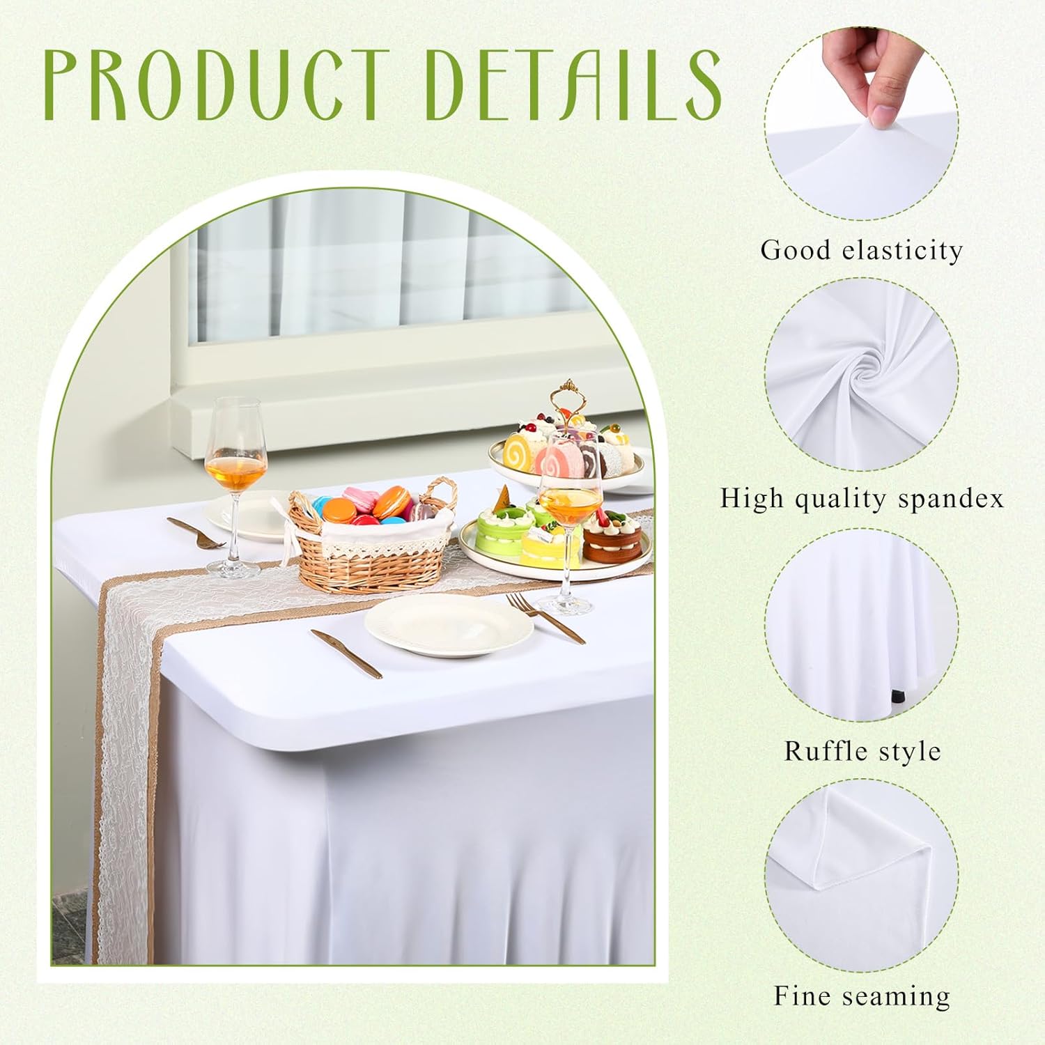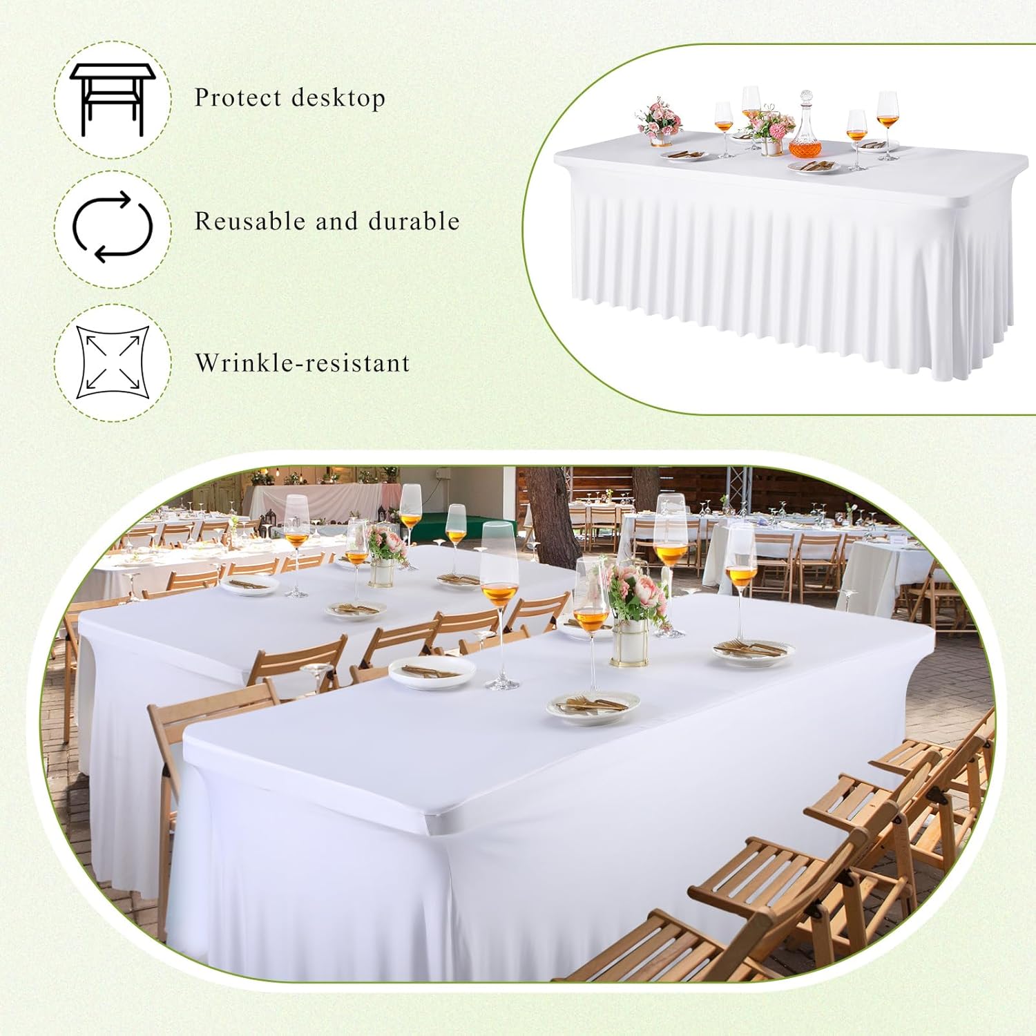 Features: Easy to use: This rectangle tablecloth for 6 foot table is a disposable product, no need to clean up after use, you can just throw it away after use, very convenient, make your life more comfortable. Thoughtful design: The spandex tablecloth and table skirt 2 in 1 piece spandex fitted tablecloth. You don't need to spend more time on shopping separately for tablecloths and table skirts, and you don't need to worry about the color matching of tablecloths and table skirts. Specifications: Material: spandex Color: white Size: about 72 x 30 x 29 inches/ 183 x 76 x 74 cm Package includes: 3 x Table cover Notes: Manual measurement, please allow slight errors on size. The color may exist a slight difference due to different screen displays. This product is not recommended for washing.