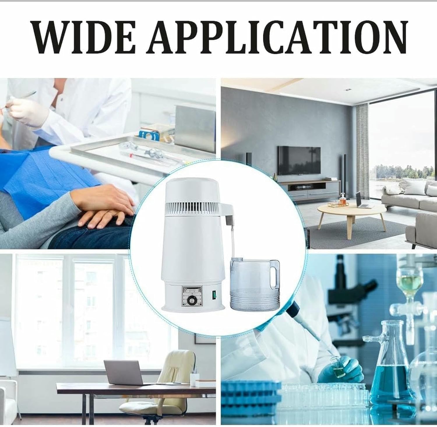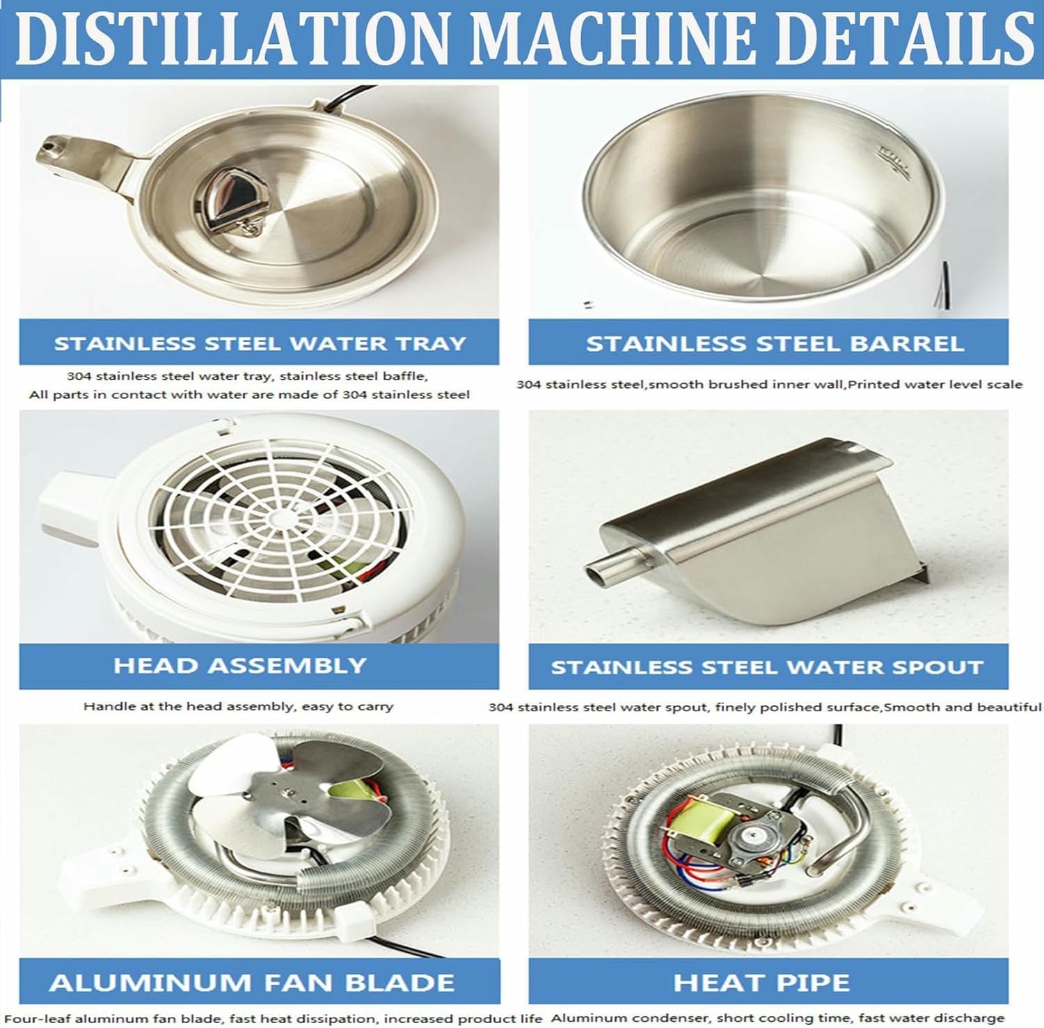 Product Description: Distiller: 304 stainless steel interior, aluminum fan blade, and plastic exterior Rated voltage: Universal (220V or 120V)(it depends on your shipping address,or please advise your voltage) Rated frequency: 50/60HZ Rated power: 750W Capacity: 4L Distilled water volume: 1L/H Steel pot assembly: SUS304/0.51MM Water outlet: SUS304 Shell: Plastic shell Control: Temperature control knob Water bucket: Plastic water bucket Head power cord: Universal/HO3-WV F/0.5 Host power cord: GS/3C/UL/BS Features: --Easy to operate, no installation required --Produces water of the safest and cleanest condition --Seamless round shaped exterior --Durable, yet lightweight and compact enough to travel with --Effectively removes most tap water impurities