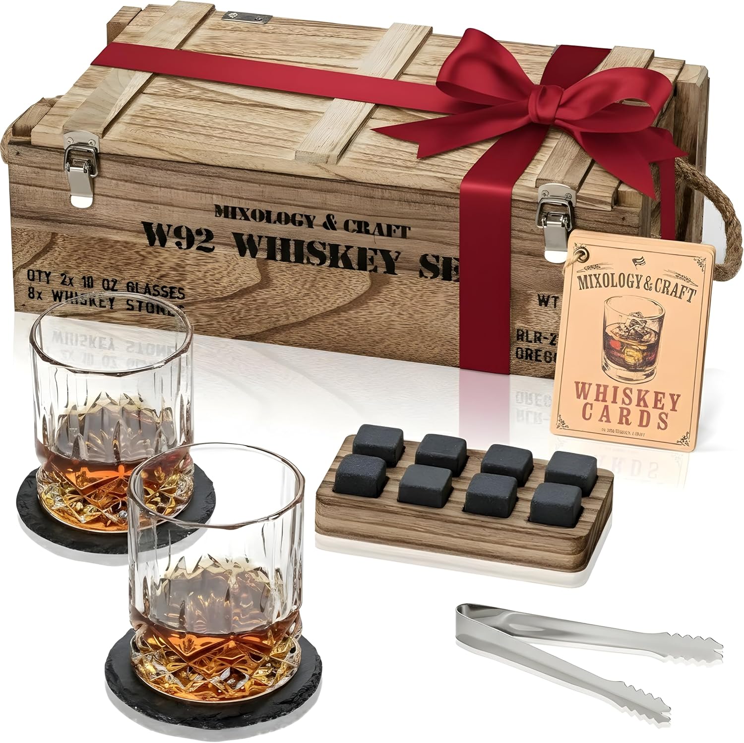 Mixology & Craft Whiskey Stones Gift Set for Men is the luxurious vintage-style whiskey gift set that will elevate the cocktail-making experience for any whiskey lover. Our handsome ammo whiskey crate contains 6 stainless steel whiskey bullets with metal tongs and velvet freezer bag, 2 lead-free bullet whiskey glasses (10oz/300ml), 2 slate coasters, and whiskey cocktail cards. Our whiskey bullets are made of premium stainless steel, are resistant to rust, and won’t scratch your Old Fashioned glasses. Unlike traditional ice, they won’t dilute your drink and provide the perfect alternative to keep your bourbon or whiskey cool. The package includes a custom-fit velvet freezer bag for storing your whiskey bullets and keeping them chilled. Transport and store your whiskey bar tools in style with our vintage-style ammunition crate. Our unique bullet whiskey glasses are impressively “shot” and match your whiskey chilling stones for an unforgettable presentation. Whether you’re giving a gift or treating yourself, our personalized whiskey glass set will impress. Perfect for Father's Day, Christmas, Valentine’s Day, birthday, graduation, wedding, anniversary, or retirement.