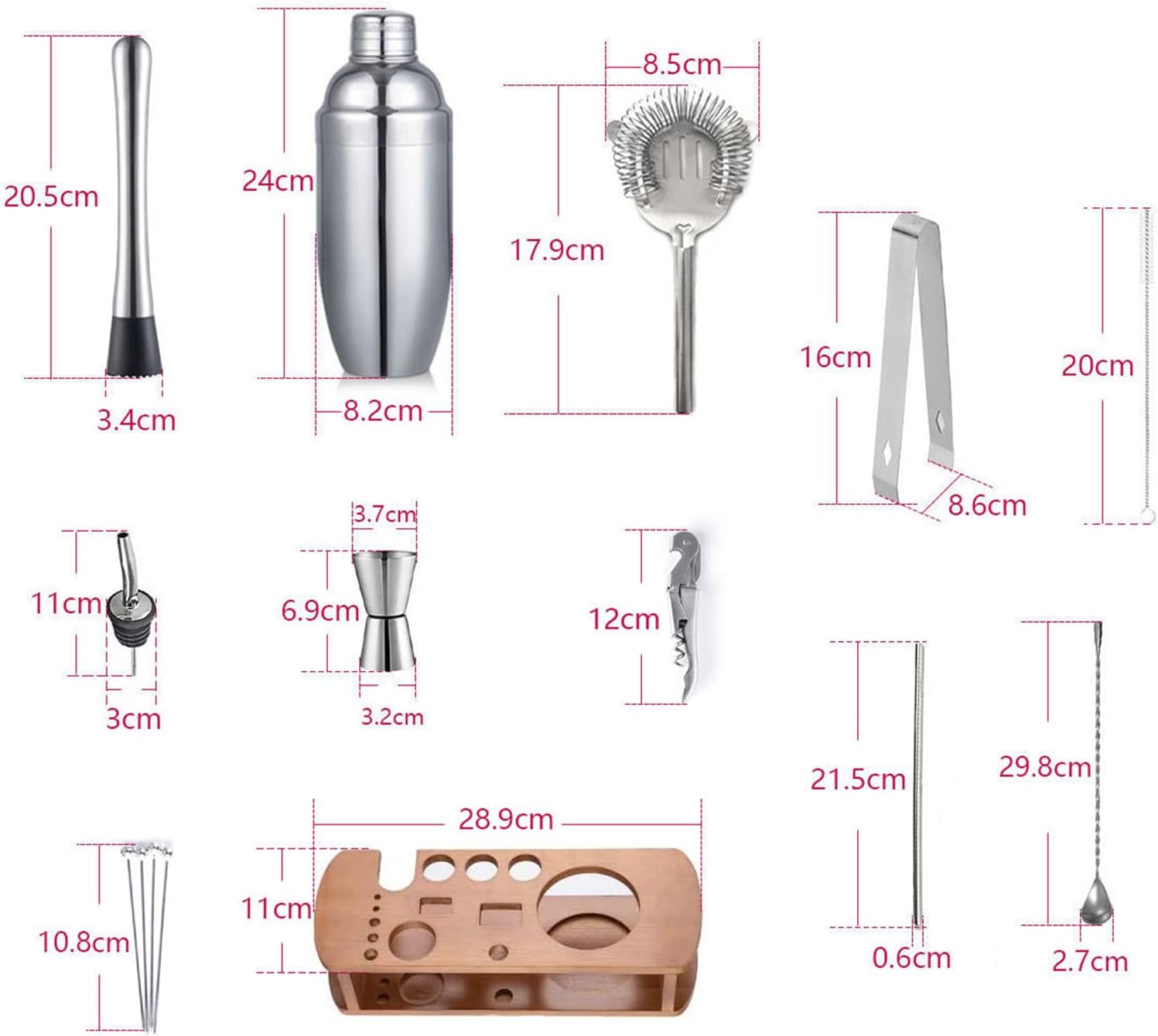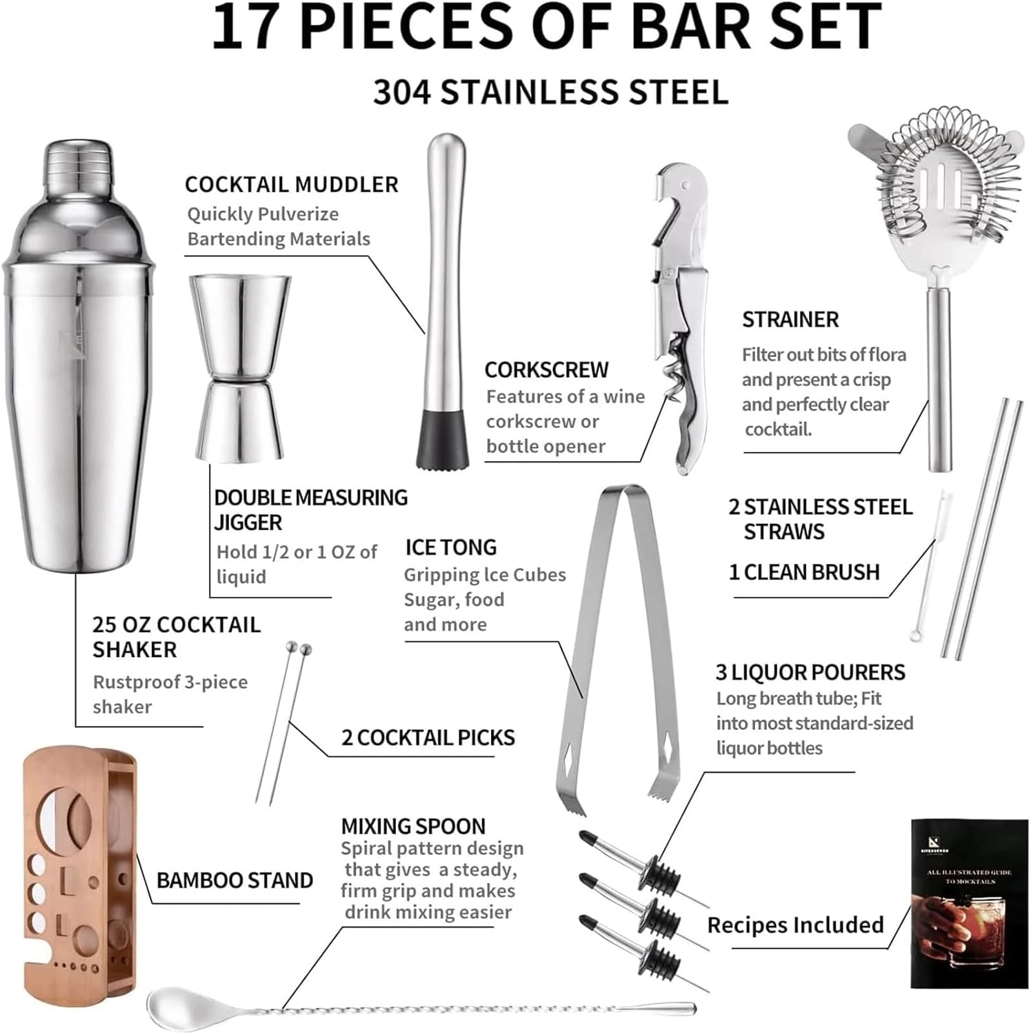 The ultimate professional cocktail making set! Get restaurant quality cocktails at home with this all-inclusive cocktail set. Made of premium stainless steel with a mirror finish, this set not only looks great but also is high quality and fun to use. Bar Tool Set provides bartenders and home mixologists with the professional quality bar tools they need to make delicious mixed drinks for years to come. Rust proof 3-piece shaker with built-in strainer Reinforced stainless steel is extra thick to protect against rust for a lifetime Ice Tong - lce cube to grab sugar, food and more Double-sided measuring jigger ensures proper balance of cocktails. Strainer - Removes a bit of flourish phases and provides a crisp, totally clear cocktail. Corkscrew-Wine corkscrew or bottle opener function The three liquor pourers with long breath tubes allow you to fill the exact amount of beer and wine into your cocktail, and fit in most standard size liquor bottles. No confusion. design provides a steady and firm grip and facilitates mixing drinks The cocktail shaker set offers the best way to entertain your guests. You must have our high quality shaker set to create that high quality cocktail you have ever wanted.