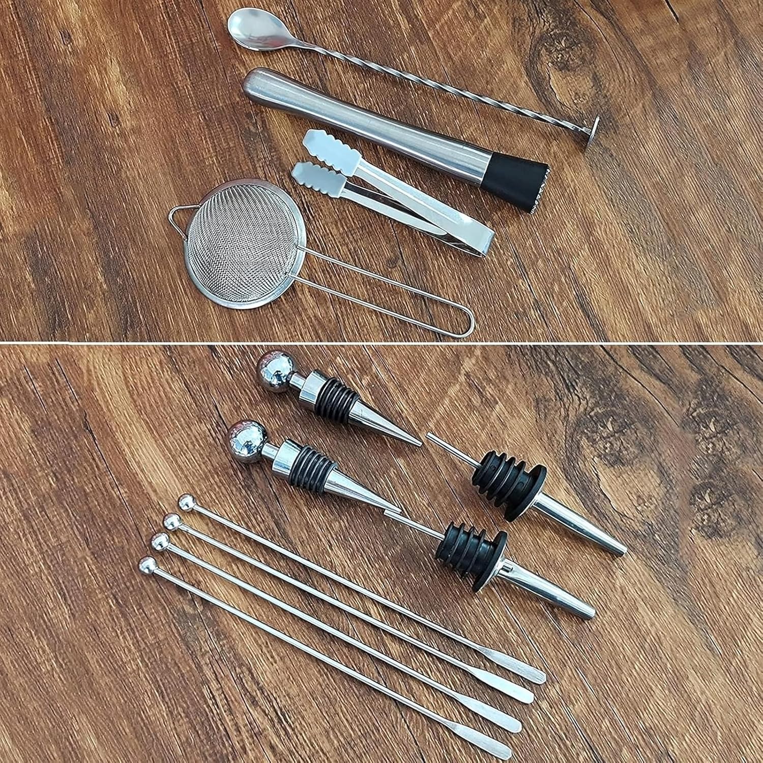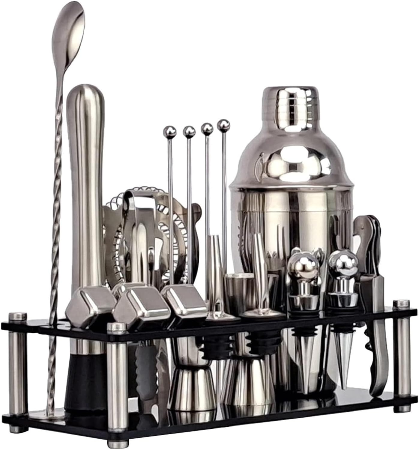 Martini Cocktail Shaker for all your cocktail mixing needs! Enhance your cocktail creation process now COCKTAIL SET INCLUDED: 1 x Acrylic Stand 1 x Cocktail Shaker - Includes built-in strainer and top sealing cap (1.2 fl oz (35 ml), 19.5 fl oz (550 ml), 25.4 fl oz (752 x Jigger 1 x Mojito Muddler 1 x Mixing Spoon 1 x Mesh Strainer 1 x Ice Tongs 2 x Bottle Stoppers 1 x Corkscrew - Wine corkscrew, bottle opener and foil cutter functions 2 x LiquorPourers - Fits most standard sized bottles 4 x Stainless Steel Fruit Sticks - Safe to use over and over again 4 x Stainless Steel Ice Cubes The acrylic stand stands carefully to protect your barware tools from scratches, keep them organized and accessible at all times. Clean up your kitchen drawers and cabinets. Show off your gorgeous cocktail kit with a unique acrylic storage rack. You will definitely get the attention of your guests! Makes a great gift for your precious wine lovers, budding bartenders, wedding showers, housewarming events, birthdays, New Year or Christmas.