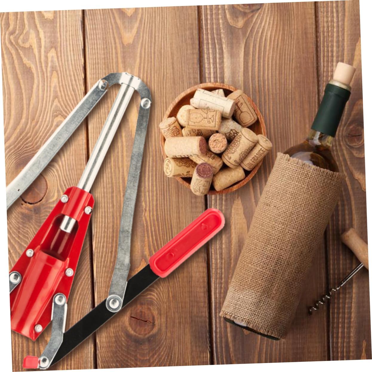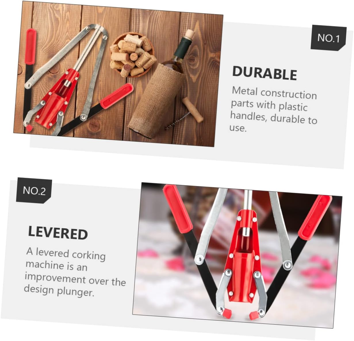 Package List 1 x Hand Corker Characteristics - Material: Iron and plastic hand corker - Color: Red corking tool - Size: About 33.00X25.00X3.50cm/12.97X9.82X1.38in - Selected material, which is not easy to deform or break corker. - Fits all bottles and can use dry corks. - Simply place the cork into the chamber, place the corker on of the bottle, and depress both levers. - As the name suggests, a lever is used to push the cork through a conical section that the cork, then into the bottle. - For results, have a bottle grip to help hold the bottle steady.Goods Descriptionhand corker This corker is made of , which can withstand the use.corker Fine workmanship, it the practicality.corking tool Features the iron and plastic material, which has high durability, not easy to deform