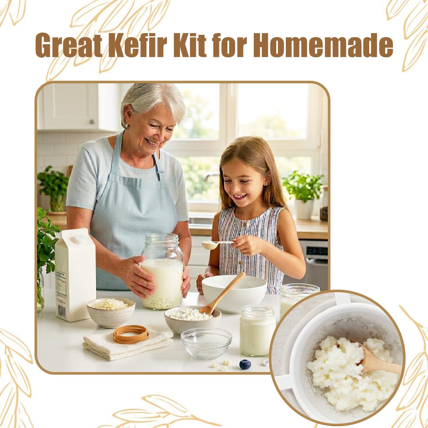 Create fresh, homemade kefir and probiotic drinks with this complete fermentation kit.Includes all essential tools needed for a smooth and reliable fermentation process. The wide mouth glass jar allows easy pouring and cleaning, while the strainer helps separate grains efficiently. The breathable cloth cover supports proper fermentation, and the lid provides convenient storage.Perfect for beginners, this kit simplifies the process of making milk kefir, water kefir, yogurt and other fermented foods at home. No complicated setup required.Enjoy the benefits of fresh, natural probiotic drinks while reducing reliance on store-bought options.Package Includes:1 X 64oz mason jar1 X white plastic lid8 X rubber bands1X measuring spoons1X wood spoon1 X temperature strip2 X cheese cloth1 X plastic strainer