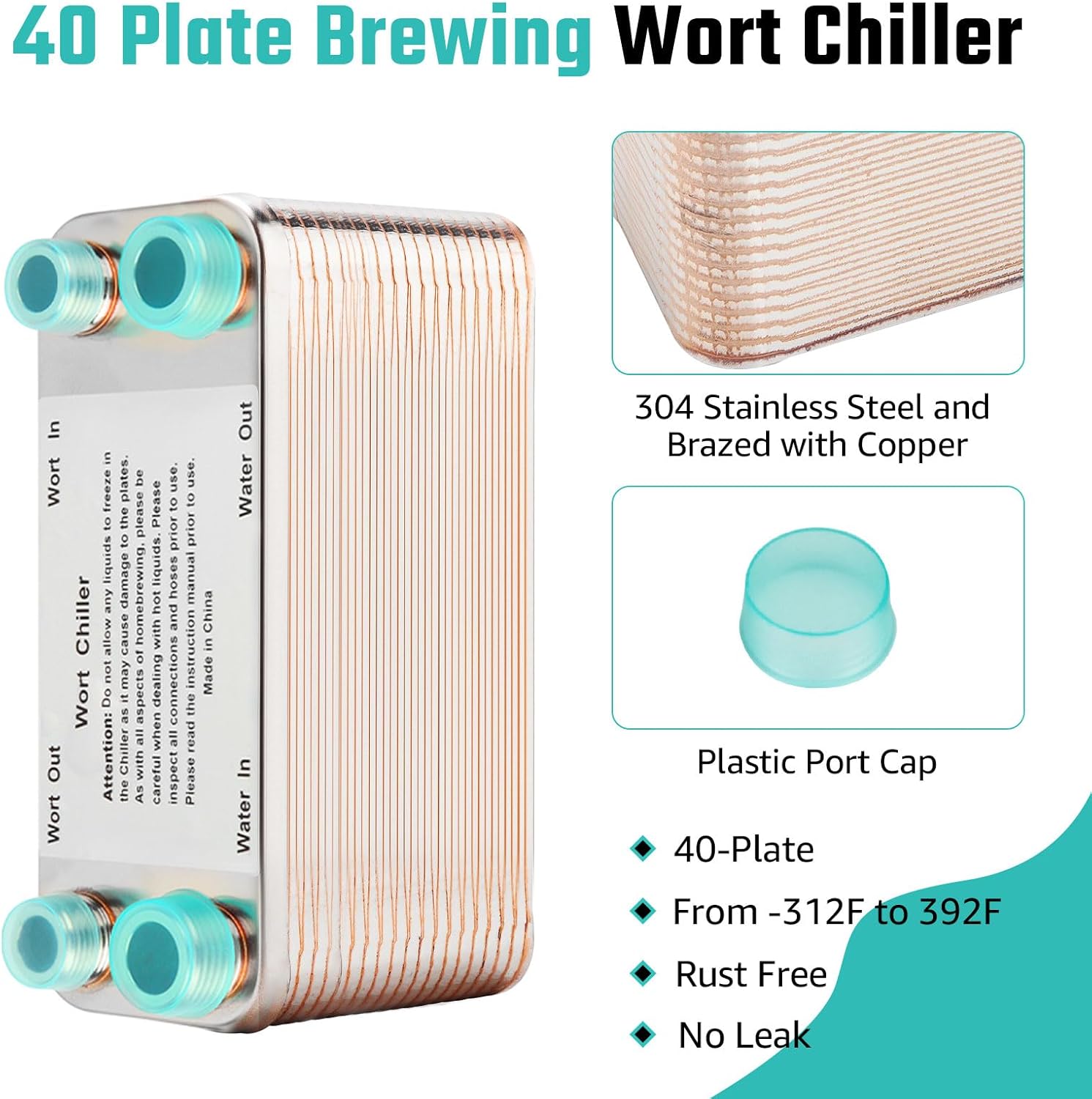 Chciyich 40 Plate Wort Chiller, Brazed Plate Heat Exchanger for Homebrew, Stainless Steel Plate Beer Brewing Wort Chiller, 1/2 & 3/4NPT Thread Wort Cooler System