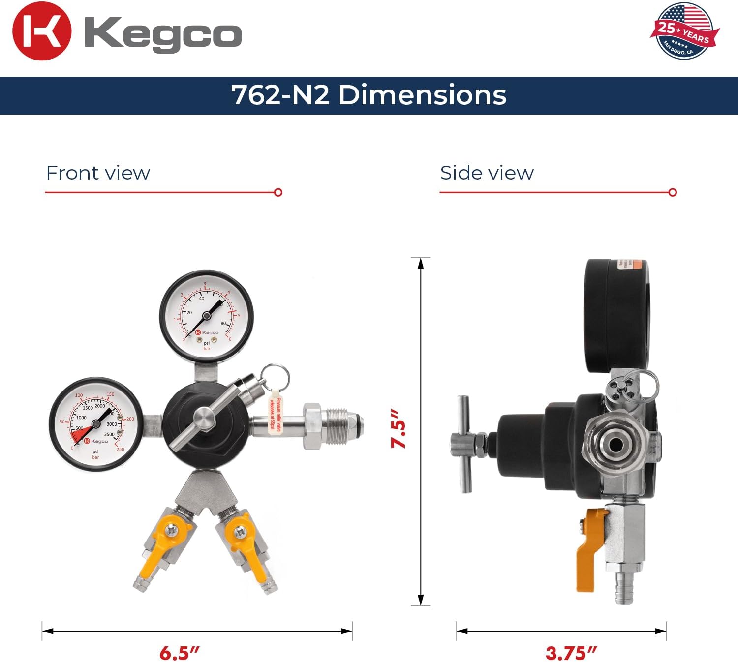 The Kegco 762-N2 Dual Gauge Two Product Commercial Grade Nitrogen Regulator ensures peak performance every time, even in demanding commercial environments like bars and restaurants. Durably constructed for a consistent flow pour after pour, it features a T-Style adjustment valve that makes it easier than ever to adjust the keg pressure when the regulator is cold. This two-product regulator includes a y splitter for applications where two kegs will be dispensed at the same keg pressure and has two independent shut-off valves. A gauge on the top of the regulator indicates the pressure inside the keg while a gauge on the side indicates the volume of gas remaining in the tank. A pressure release valve is conveniently located on the regulator body.