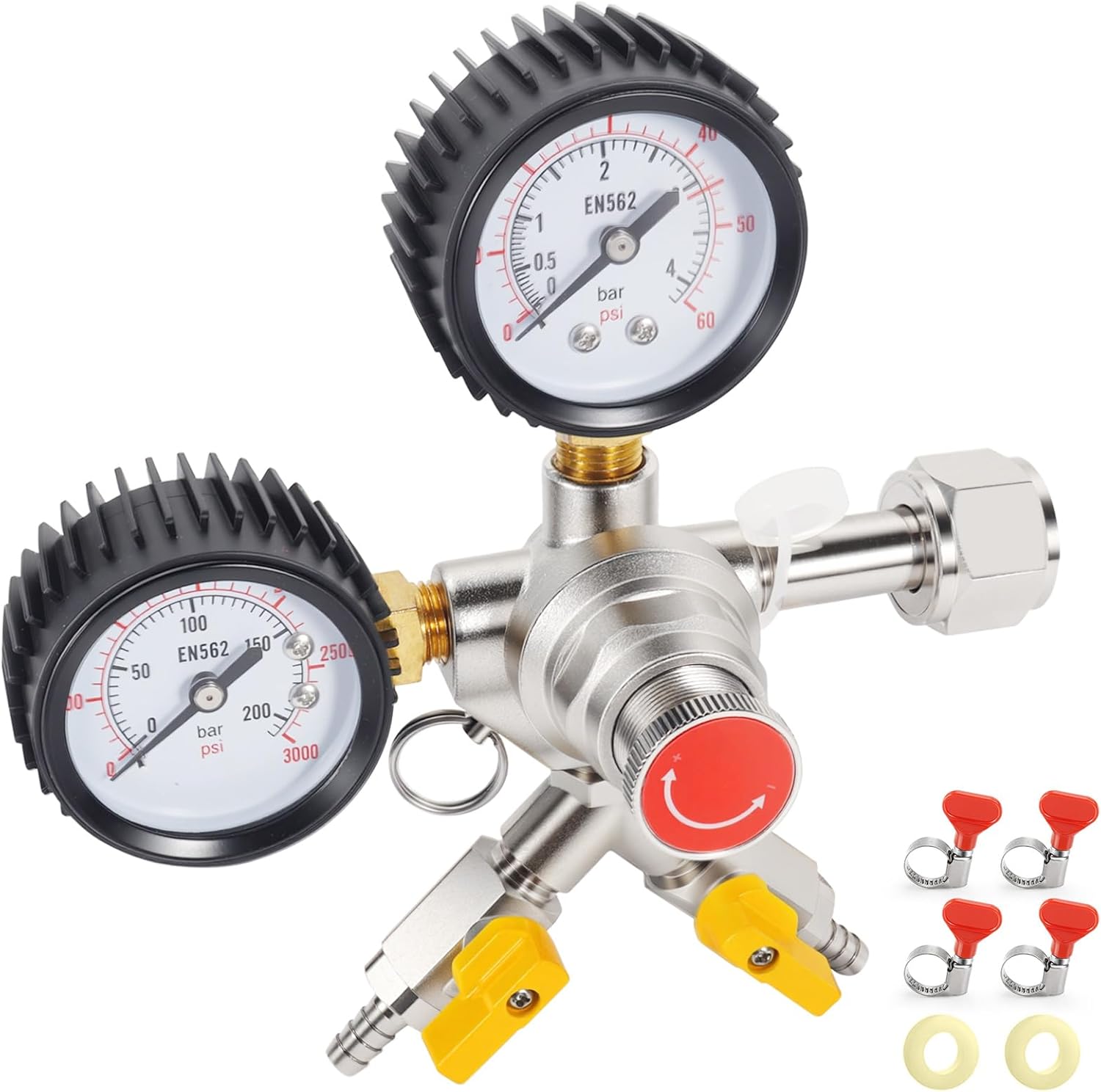 • Y-Shaped Dual Output for Simultaneous Dispensing: Effortlessly tap two kegs at once with our unique Y-type co2 regulator! Perfect for serving two different homebrews or connecting to additional equipment like a carbonator. Ideal for parties and gatherings, it maximizes your kegerator's functionality and enjoyment, offering unparalleled convenience