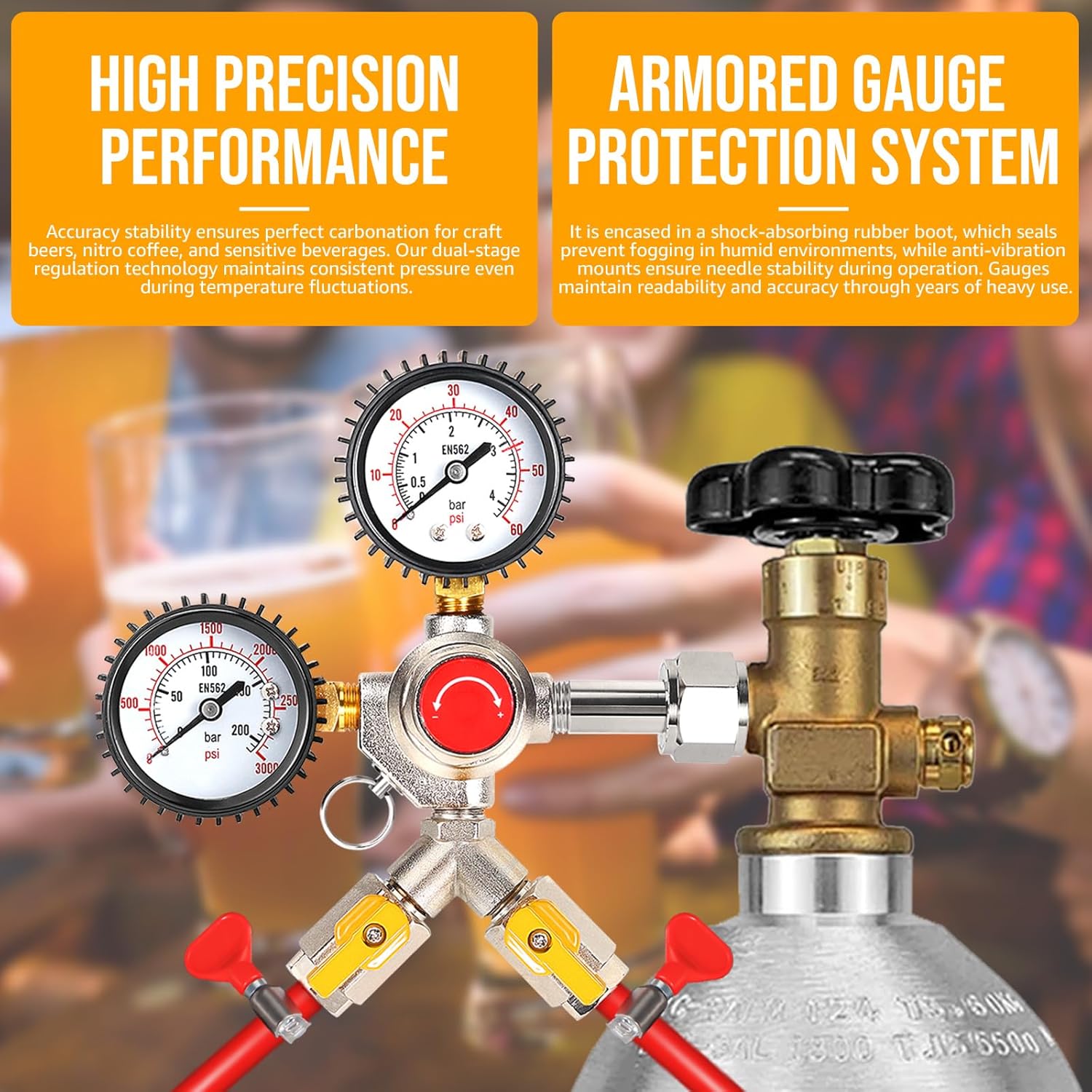 • Precision Dual Gauge for Ultimate Carbonation Control: The co2 tank regulator has two high-precision gauges which can gain complete command over your brew. One monitors cylinder pressure to check CO2 levels, preventing unexpected run-outs. The other accurately displays output pressure, allowing you to dial in the perfect PSI for flawless foam and optimal taste in every pour